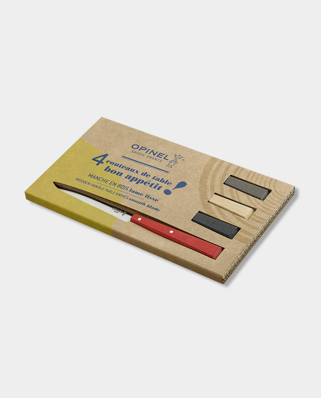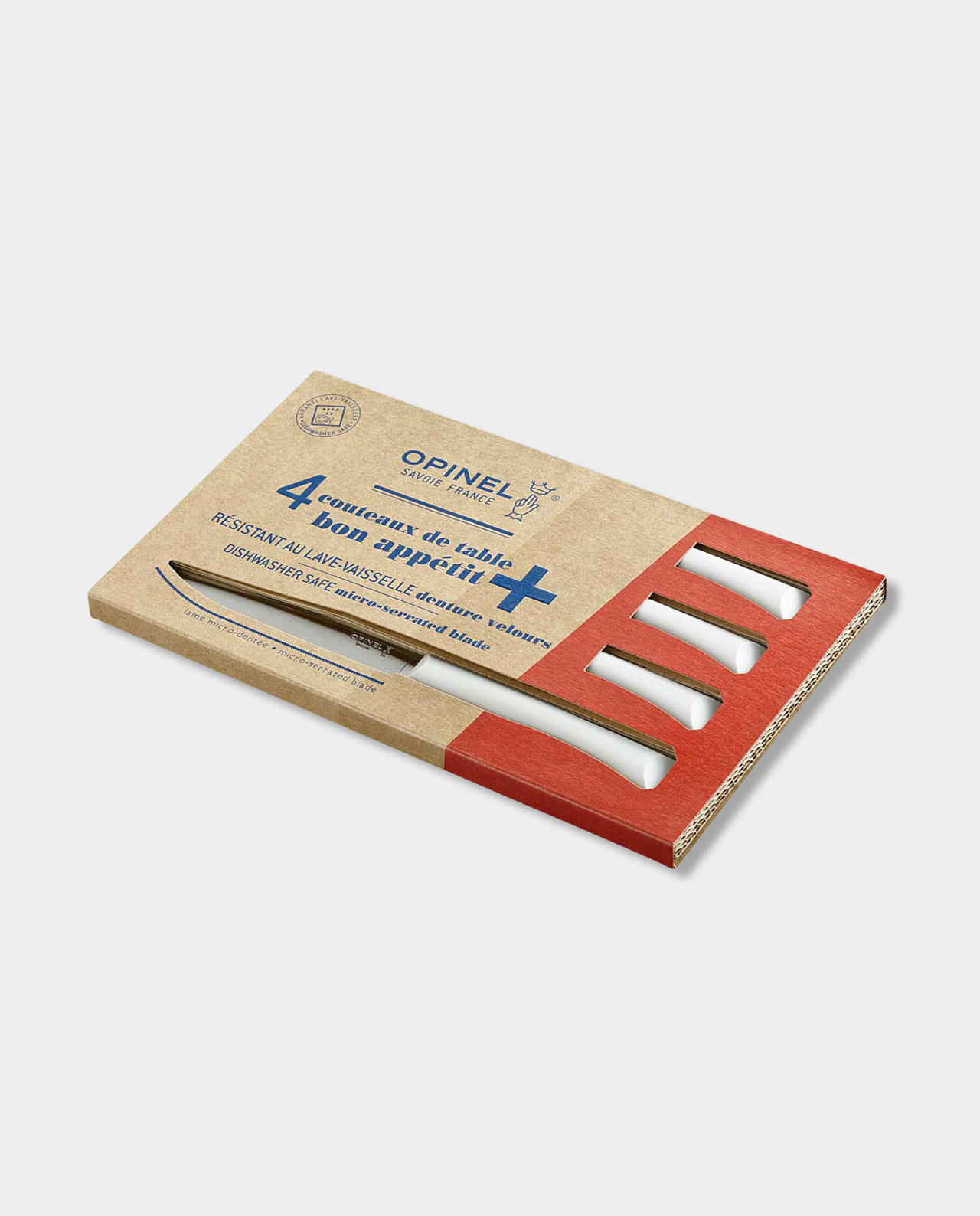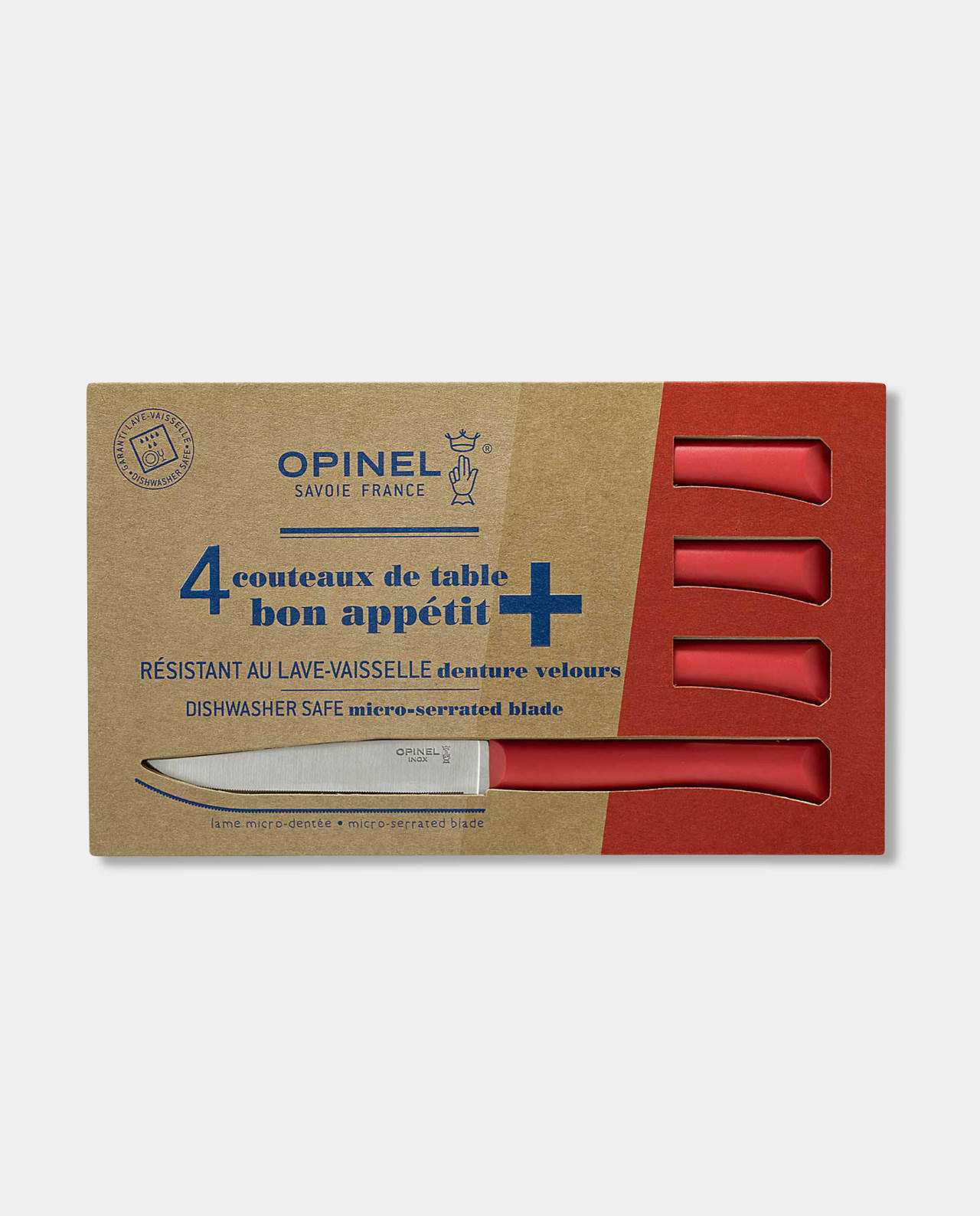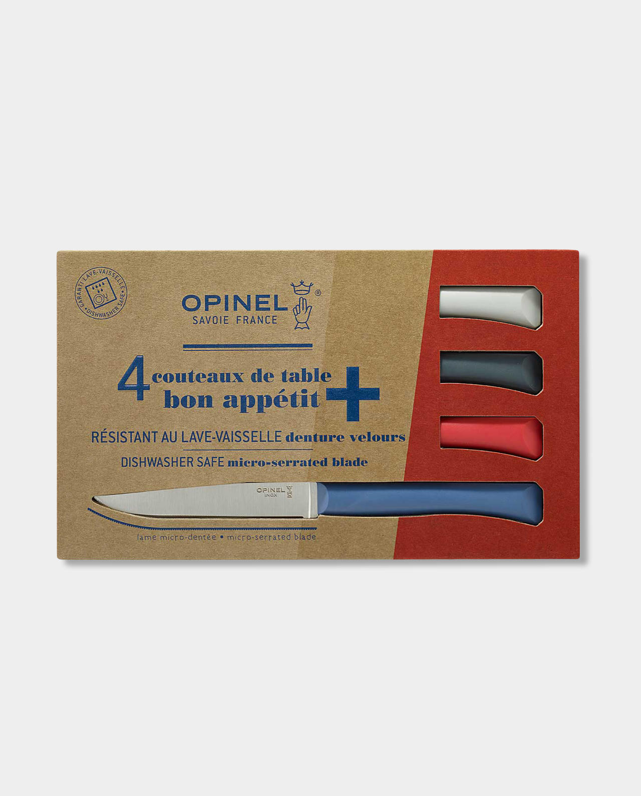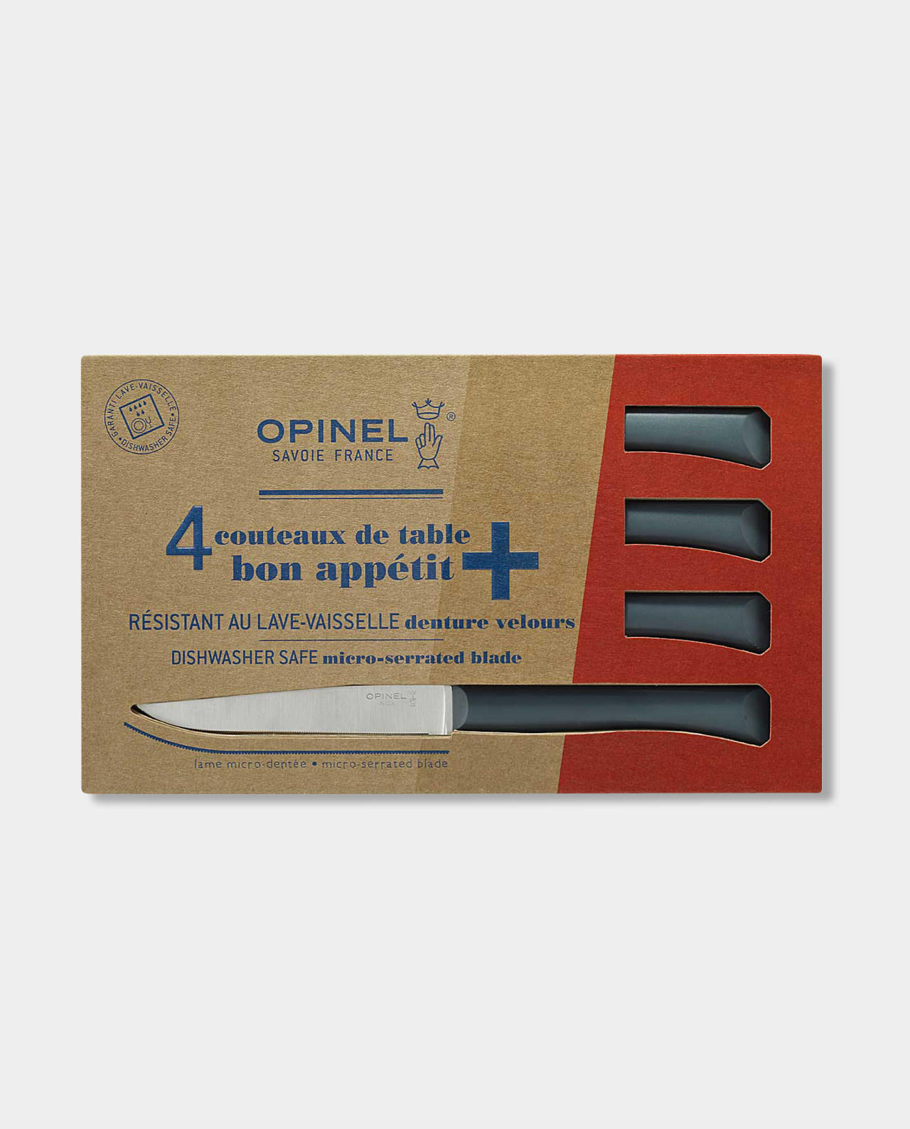 Mit diesem Tafelmesser hält Opinel am Design der Serie BON APPÉTIT fest, setzt jedoch auf Werkstoffe und Innovationen der BON APPÉTIT+ Modelle. So ist die Klinge aus rostfreiem Sandvik-Stahl 12C27 mit einer feinen Mikrozahnung versehen, die ein einfaches Schneiden gewährleistet. Als Griffmaterial wird der thermoplastische Kunststoff POM eingesetzt, der es erlaubt, das Messer auch in der Spülmaschine zu reinigen.