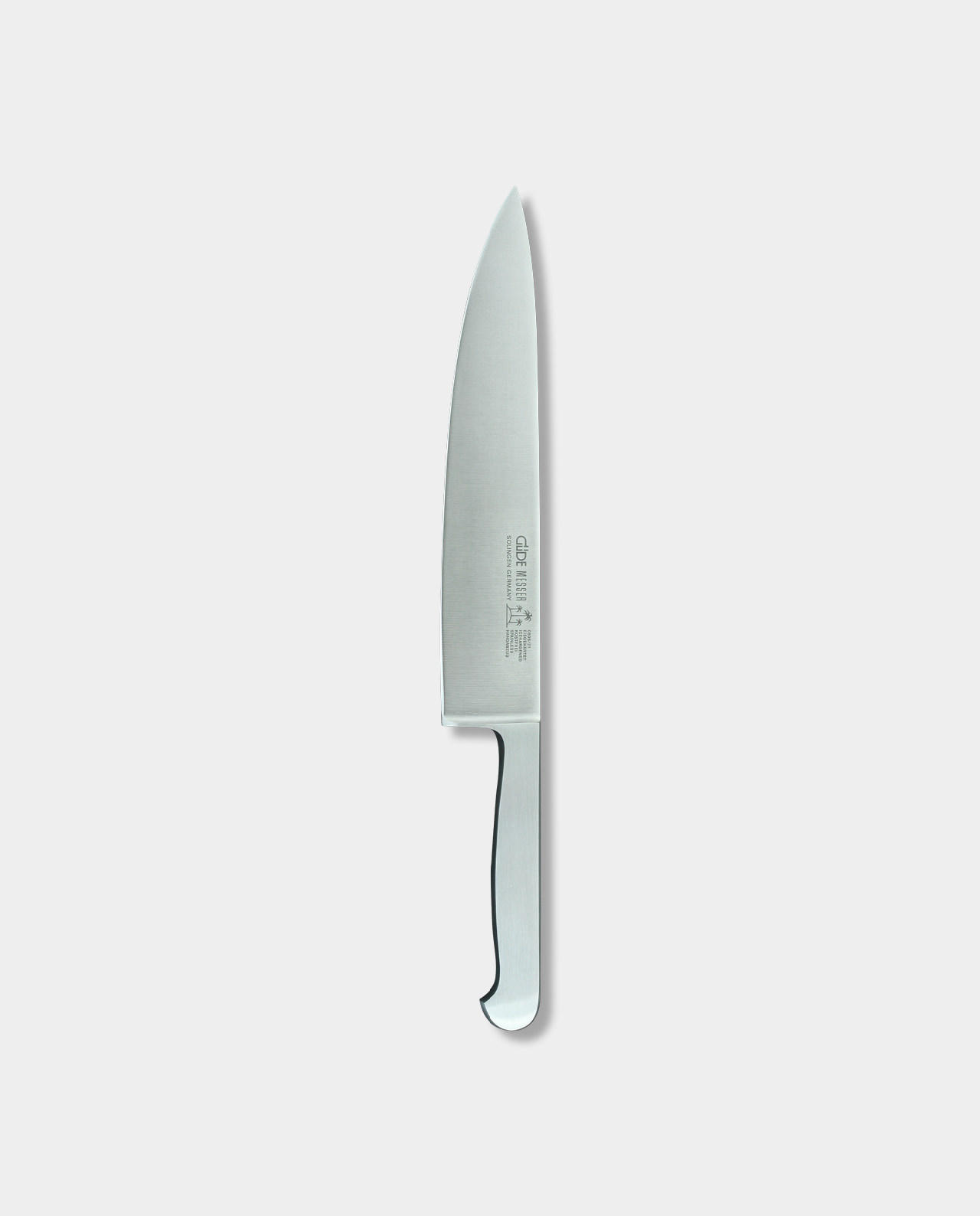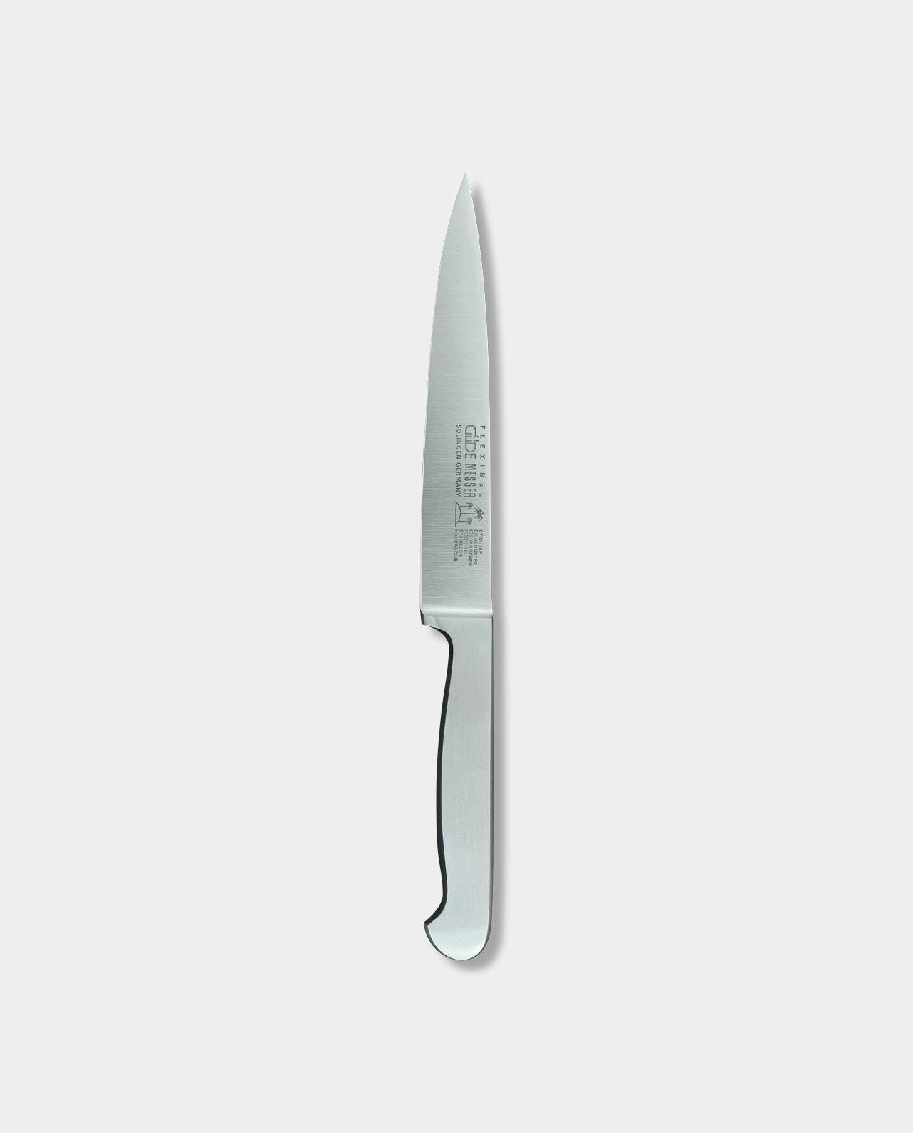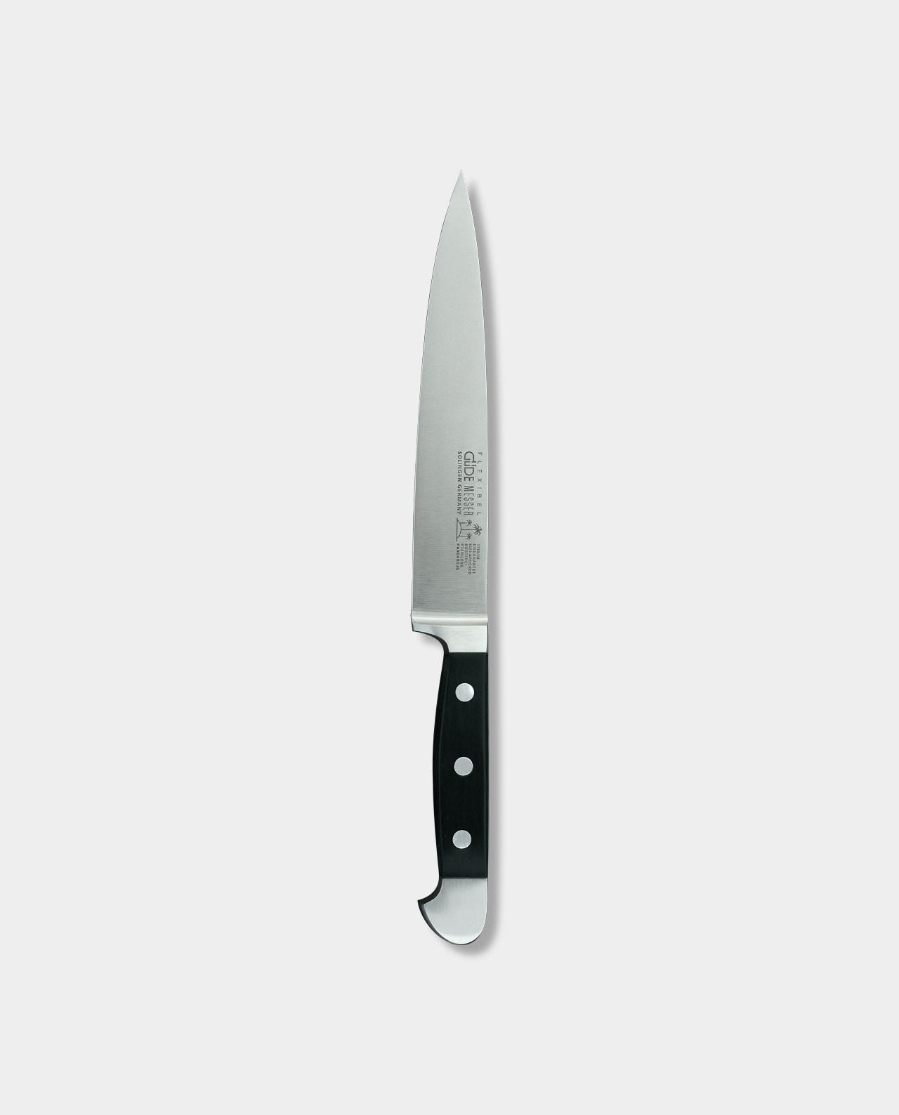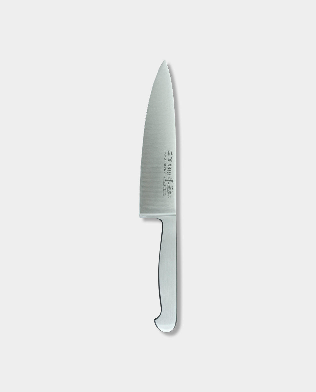 Der Klassiker und das Herzstück der professionellen Küche ist das Kochmesser mit seiner stabilen Klinge. Es ist der wichtigste Küchenhelfer für alle Gelegenheiten: zum Schneiden von Gemüse, Fleisch oder Fisch. Die geschwungene Klingenform erleichtert außerdem den Wiegeschnitt und ist damit ideal für die Verarbeitung von Kräutern und Zwiebeln.