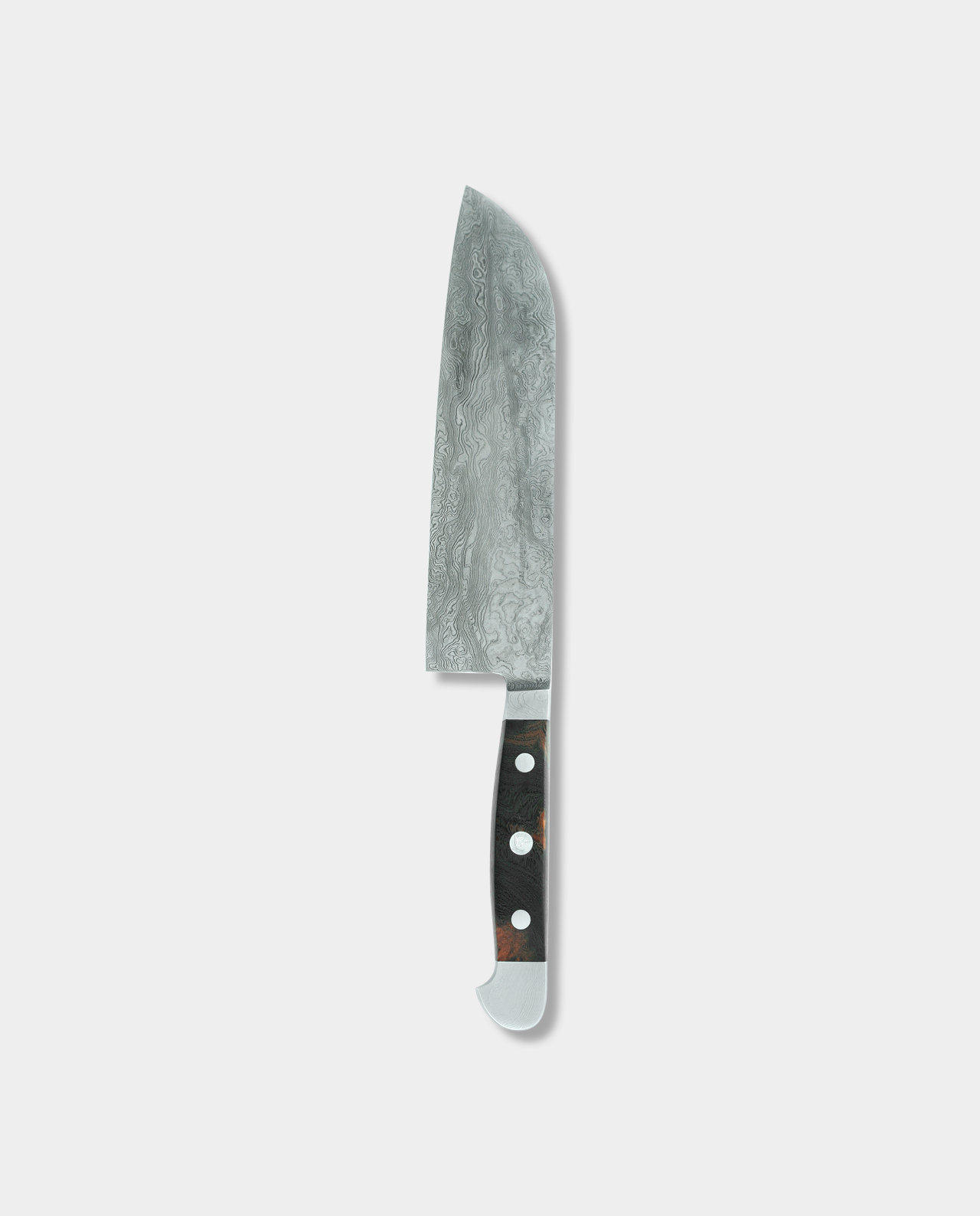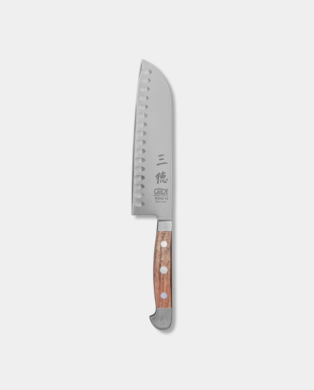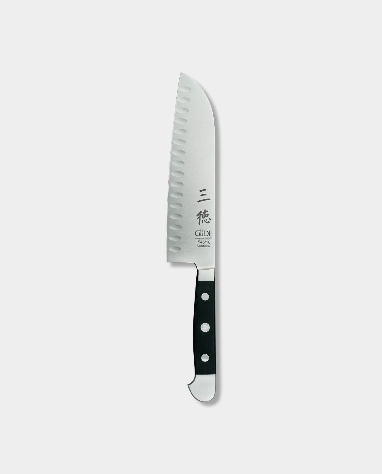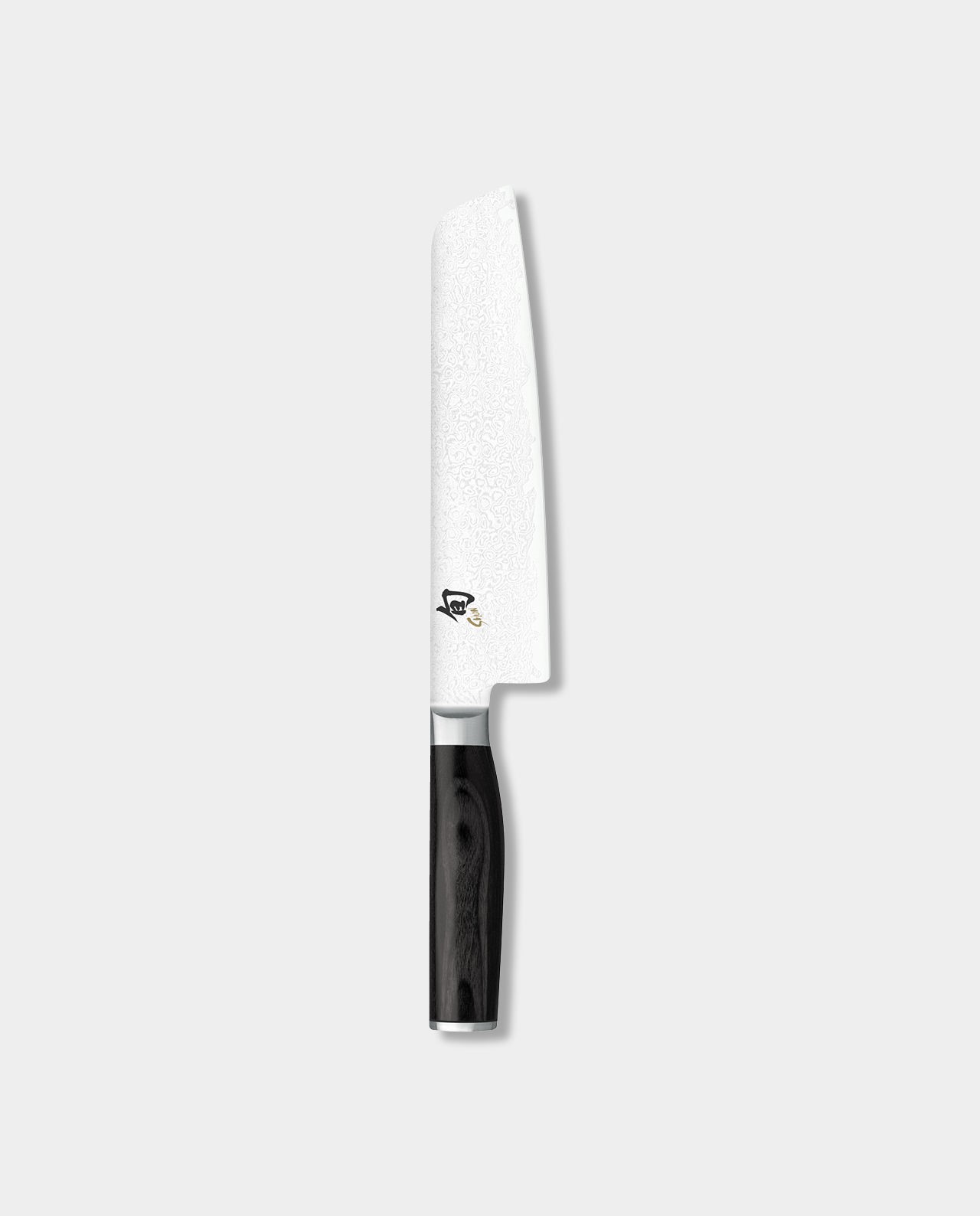 Diese traditionelle asiatische Klingenform ermöglicht einen vielseitigen Einsatz zum Schneiden von Fisch, Fleisch und Gemüse. Die eingeschliffenen Kullen erzeugen Luftpolster, die das Haften des Schneidguts minimieren und somit besonders feine Schnitte ermöglichen.