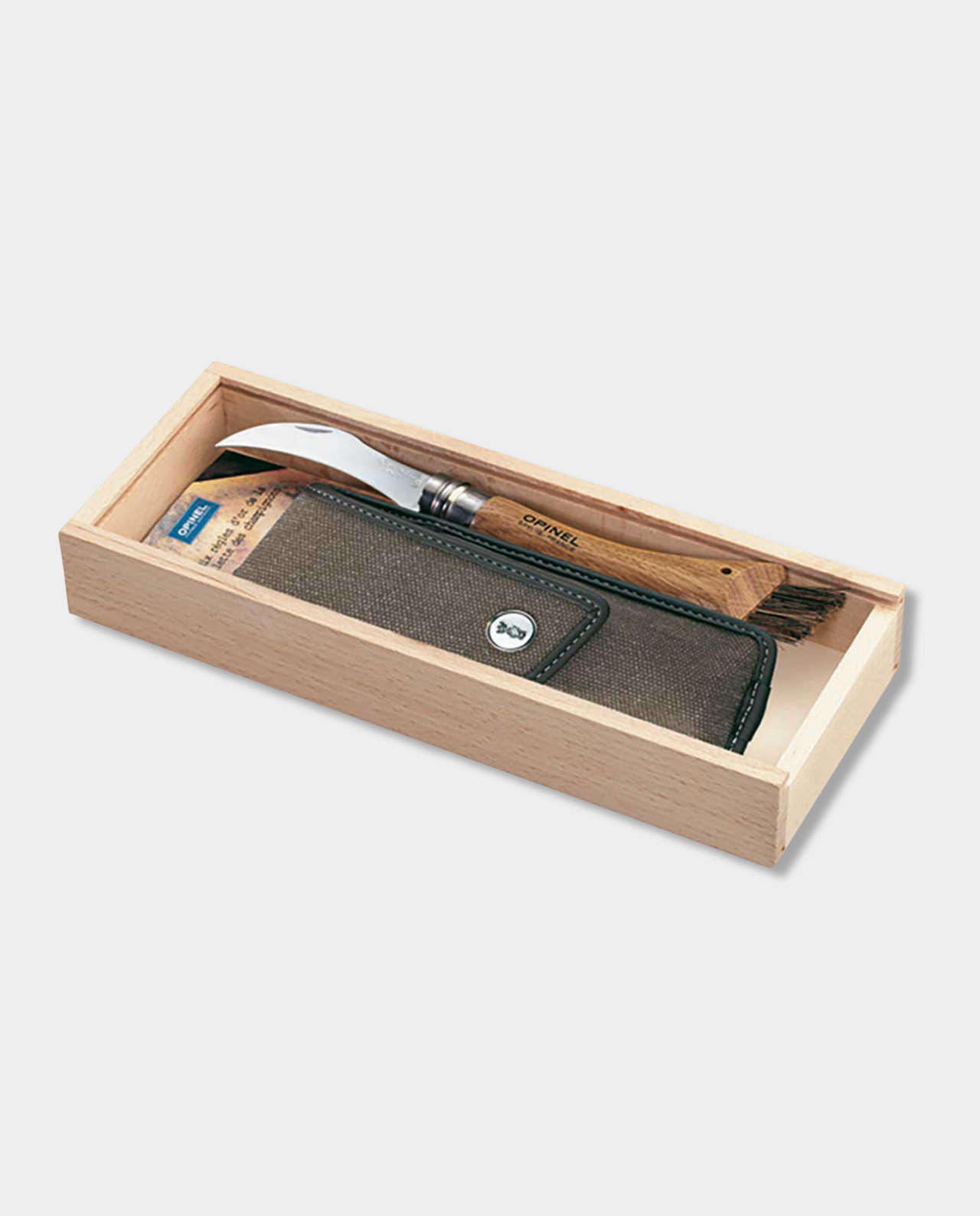 Dieses Opinel-Messer wurde für das Sammeln und die Vorbereitung von Pilzen entwickelt. Mit der feinen, gebogenen Sandvik-Stahlklinge mit gezahntem Rücken können Pilze problemlos gehäutet werden. Am Ende des Griffes aus naturfarbenem, lackierten Eichenholz befindet sich eine Bürste aus Wildschweinborsten. Das Opinel-Pilzmesser wird mit einem braunen Segeltuch-Etui in einer dekorativen Holzbox geliefert.