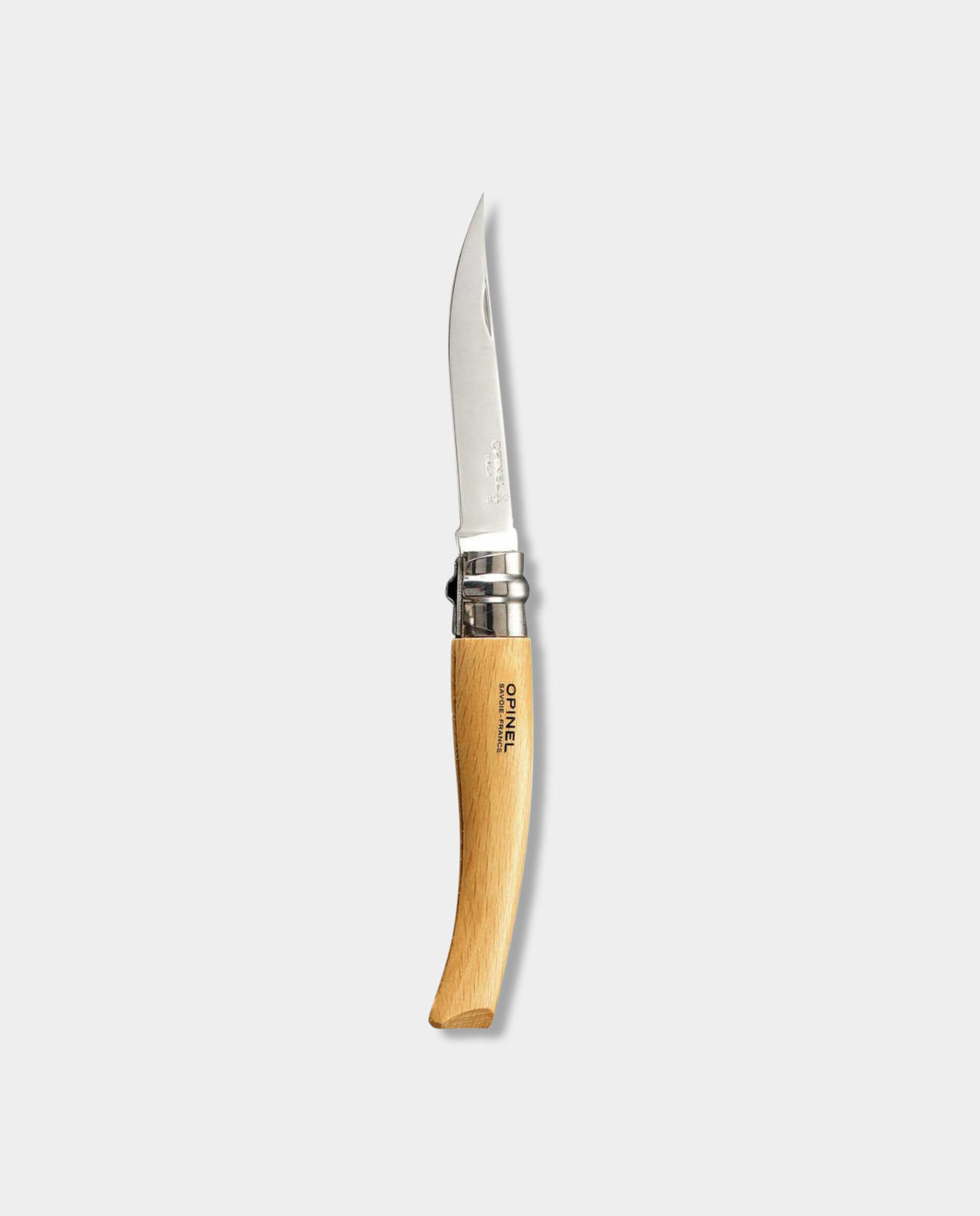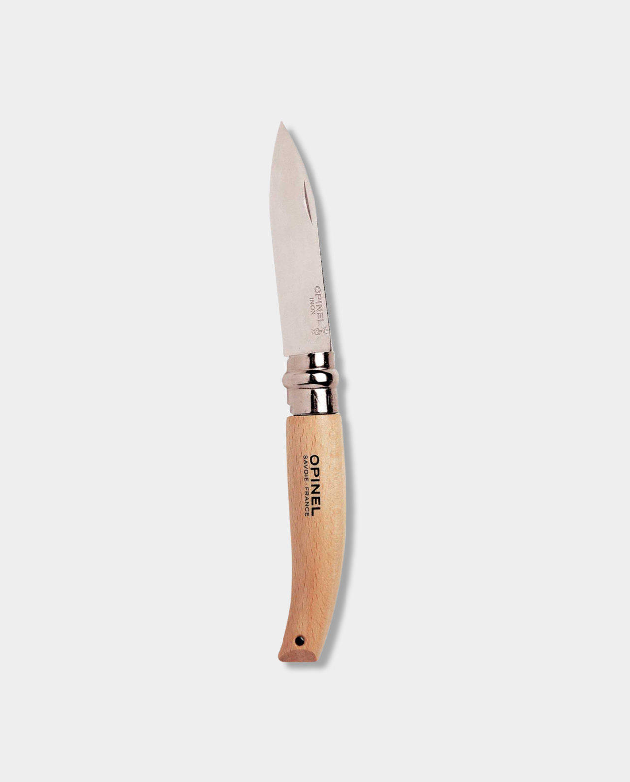 Für schlanke, elegante Taschenmesser steht die Opinel-Serie Slim-Line. Dieses Exemplar mit der Opinel-Größe 10 bietet eine rostfreie Edelstahl-Klinge und einen attraktiven Griff aus Buchenholz. Die Klinge lässt sich mittels des Virobloc-Sicherungsringes feststellen.