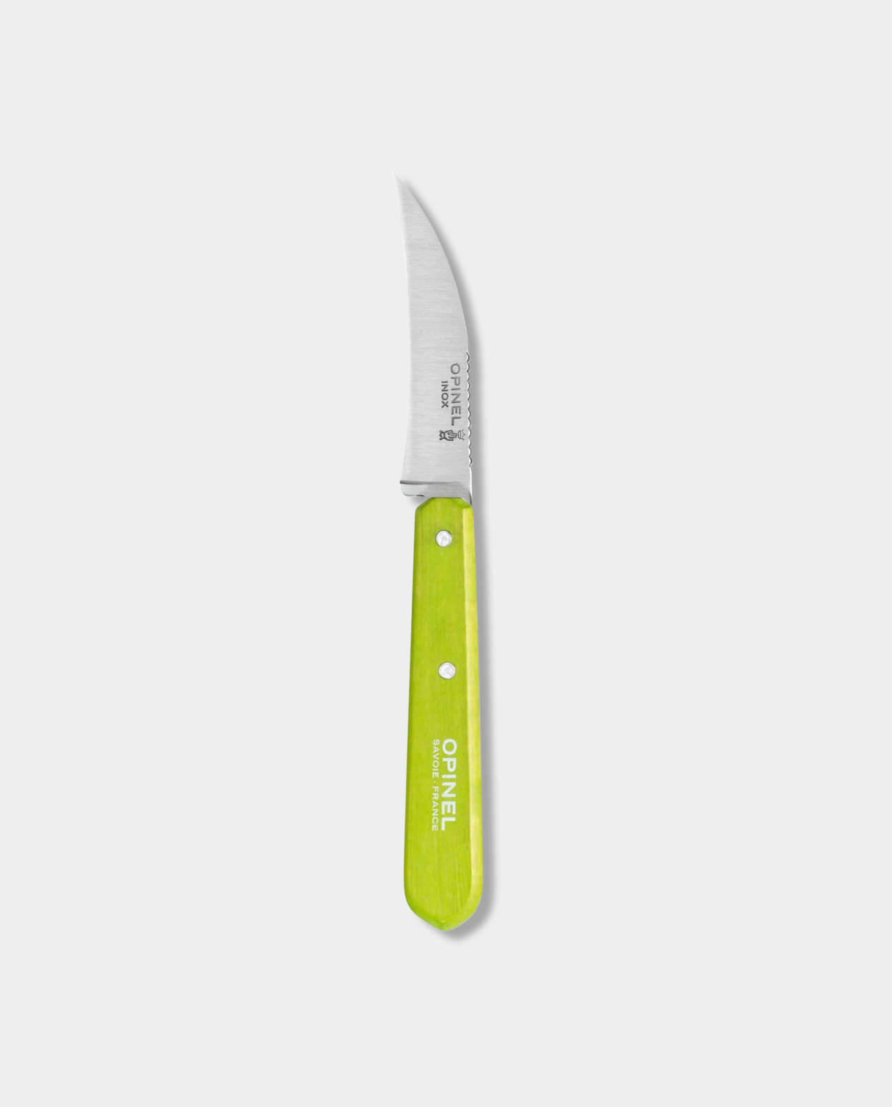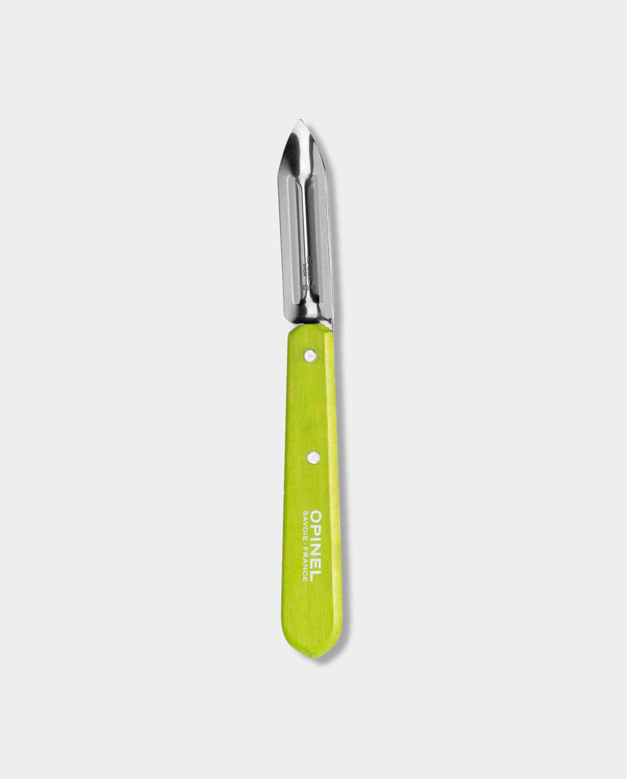 Mit dem Opinel Schälmesser Nr. 115 lassen sich Obst und Gemüse schnell und effizient schälen. Die doppelte Klinge aus rostfreiem Edelstahl ermöglicht die Verwendung für Rechts- und Linkshänder. Aufgrund des Griffs aus hellgrün gefärbtem Buchenholz sollte das Messer nicht in der Spülmaschine gereinigt werden.