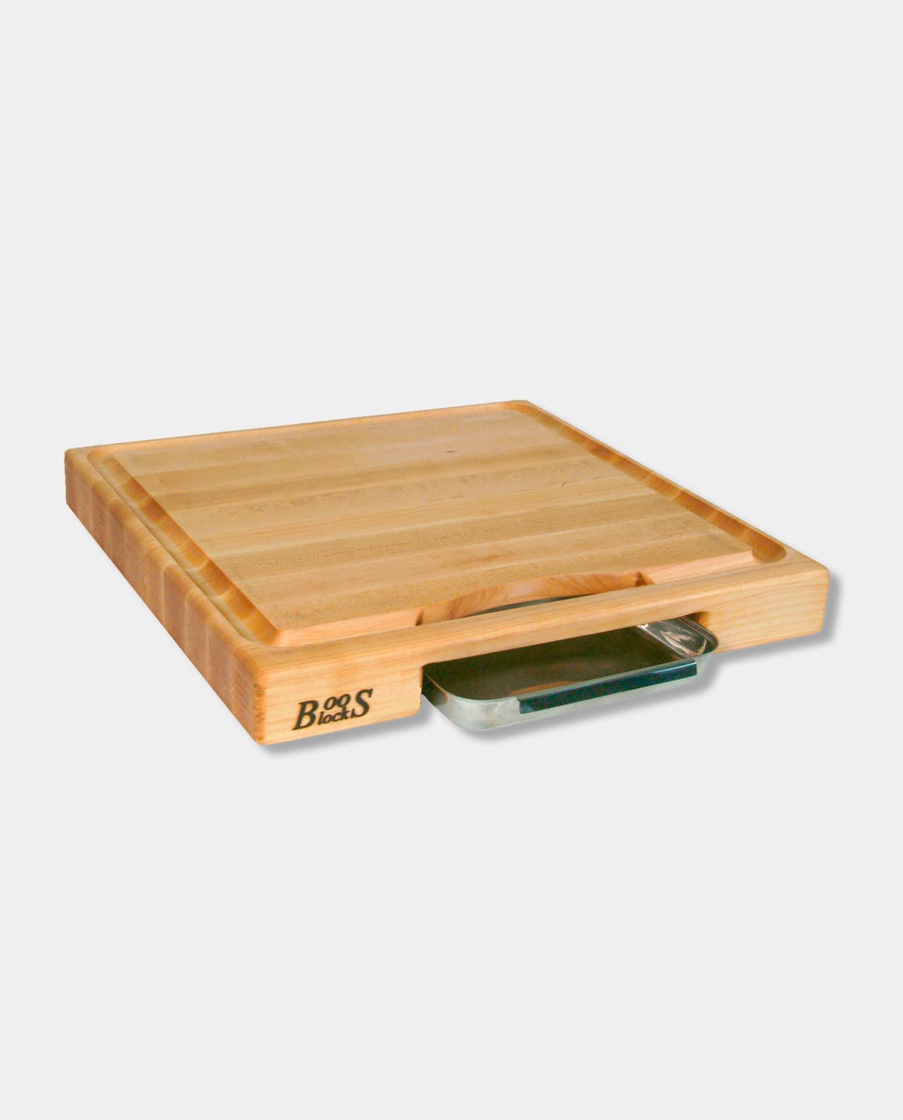 Schneidebrett, Langholz, beidseitig benutzbar mit Saftrille und Auffangschale aus Edelstahl, Nordamerikanisches Ahorn- Hartholz, NSF zertifiziert, 46 x 46 x 6 cm; 7,5 kg