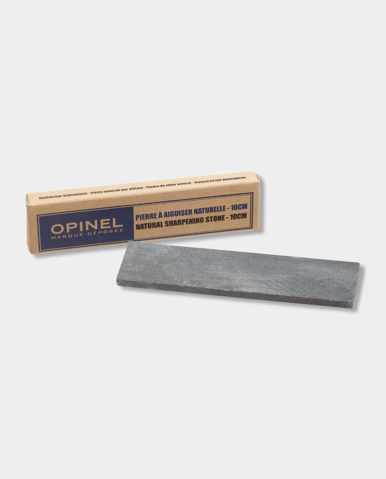 Naturschleifstein von Opinel – geeignet für alle Opinel-Messer mit glatter Klinge. Die Steine, im Gebiet Lombardei in Italien abgebaut, bestehen aus einer Zusammensetzung von Quarz und Karbonat. Um Beschädigungen an der Klinge zu vermeiden ist es erforderlich, den Stein vor dem Gebrauch mit Wasser anzufeuchten.