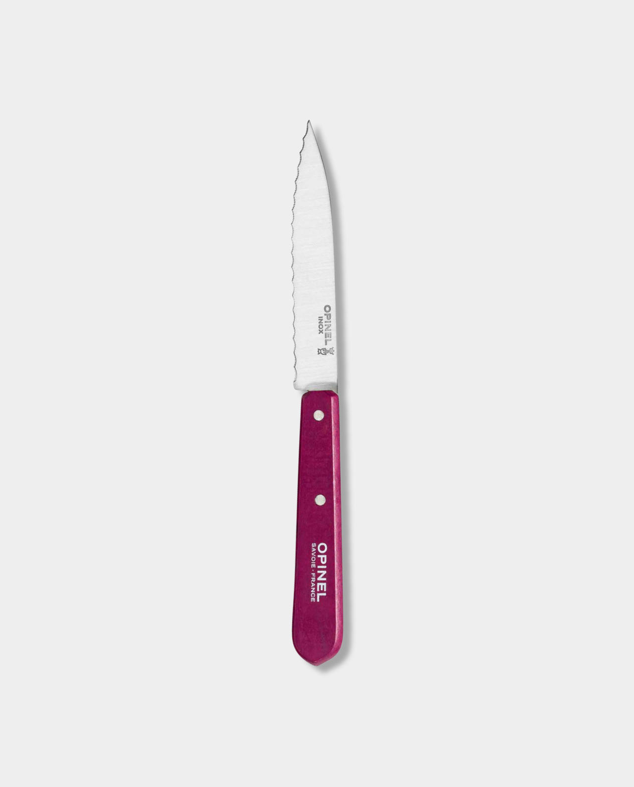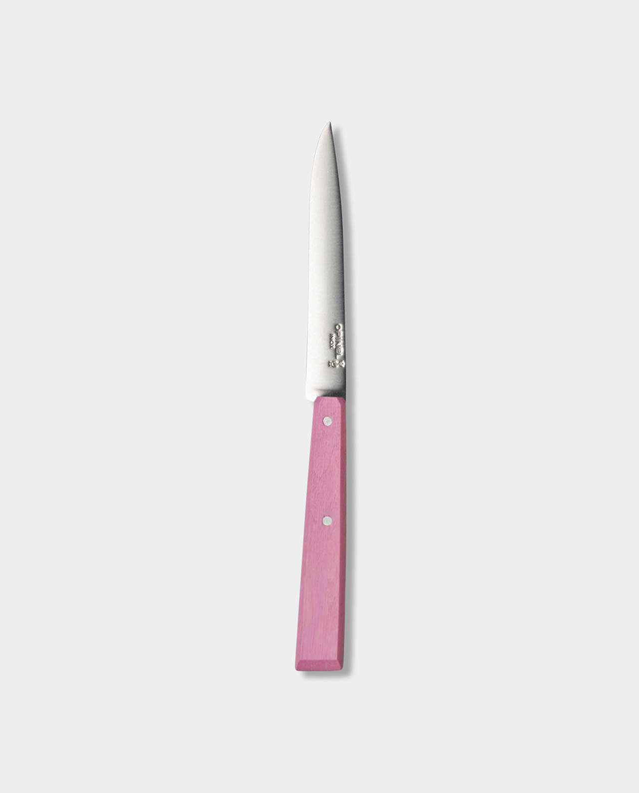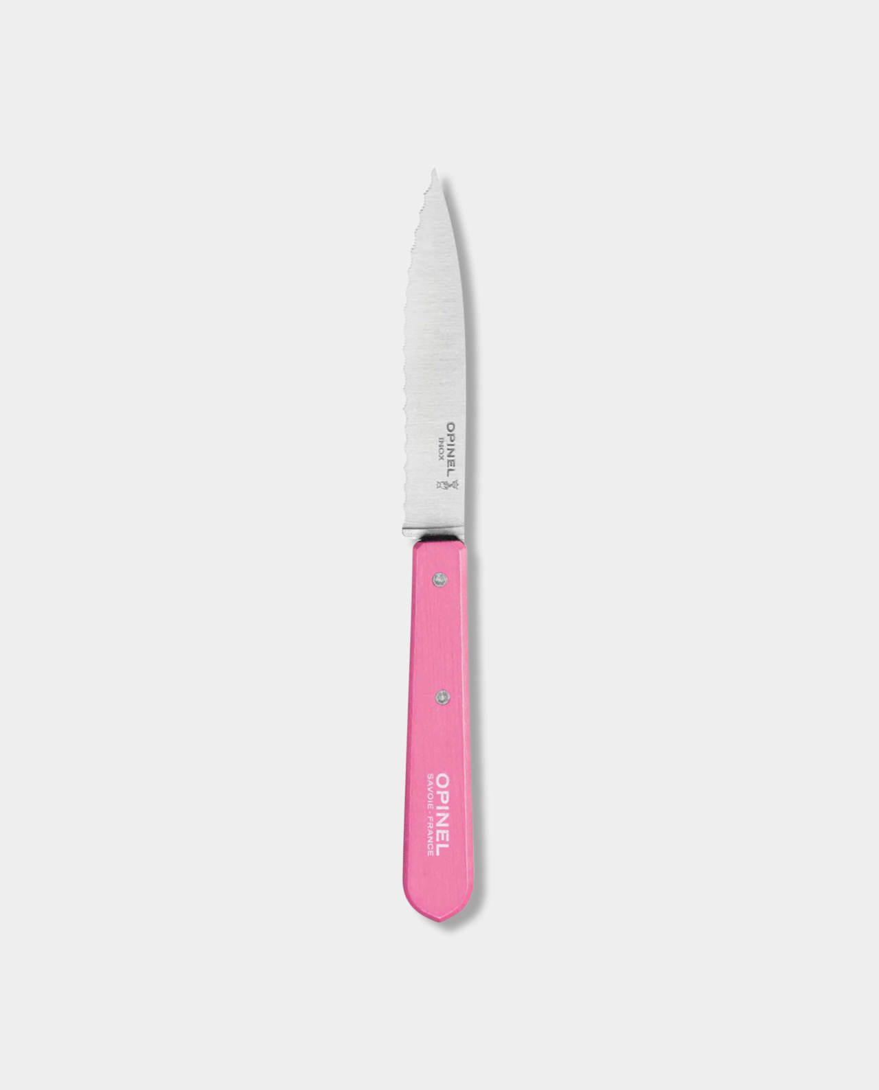 Tafelmesser aus der Opinel Messerserie Bon Appétit POP SPIRIT. Die 11 cm lange, glatte Klinge ist aus rostfreiem Stahl 12C27 gefertigt. Damit die Qualität erhalten bleibt, sollte das Messer nur von Hand gereinigt werden. Grifffarbe: pink