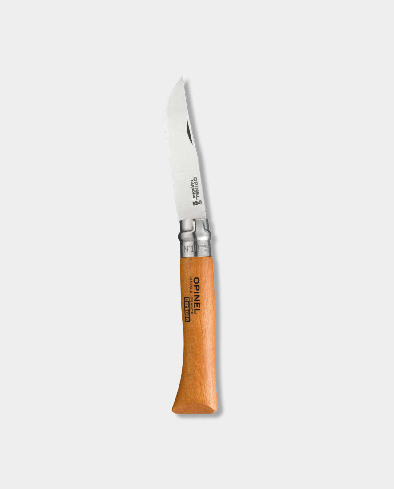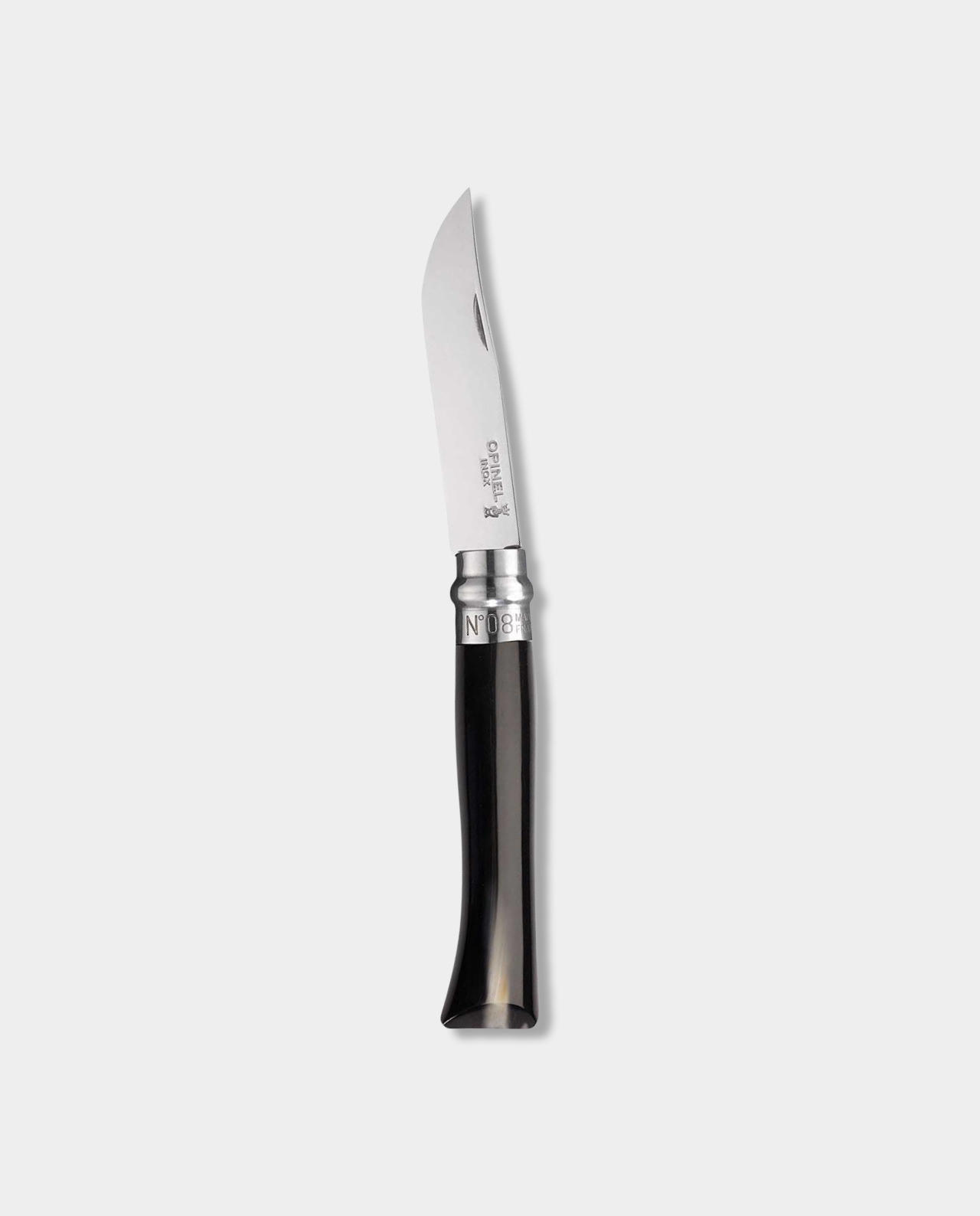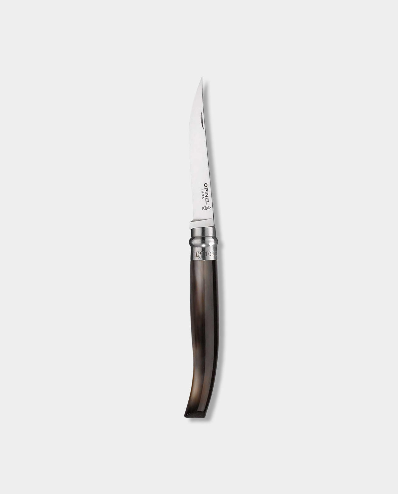 Anstelle des sonst üblichen Holzgriffs wurde bei diesem Opinel Slim-Line Modell Nr. 10 als Griffmaterial Horn verarbeitet. Die Griffe werden bei dem französischen Designer Jacques Mongin gefertigt, die Endmontage erfolgt bei Opinel. Es wird ausschließlich die Hornspitze zu Griffen verarbeitet, der Teil, der als einziges aus Vollmaterial besteht. Um den hochwertigeren Charakter weiter zu betonen, ist die rostfreie Edelstahlklinge mit einem hochglanzpolierten Finish versehen. Eine Holzbox zur Aufbewahrung ist im Lieferumgang enthalten.