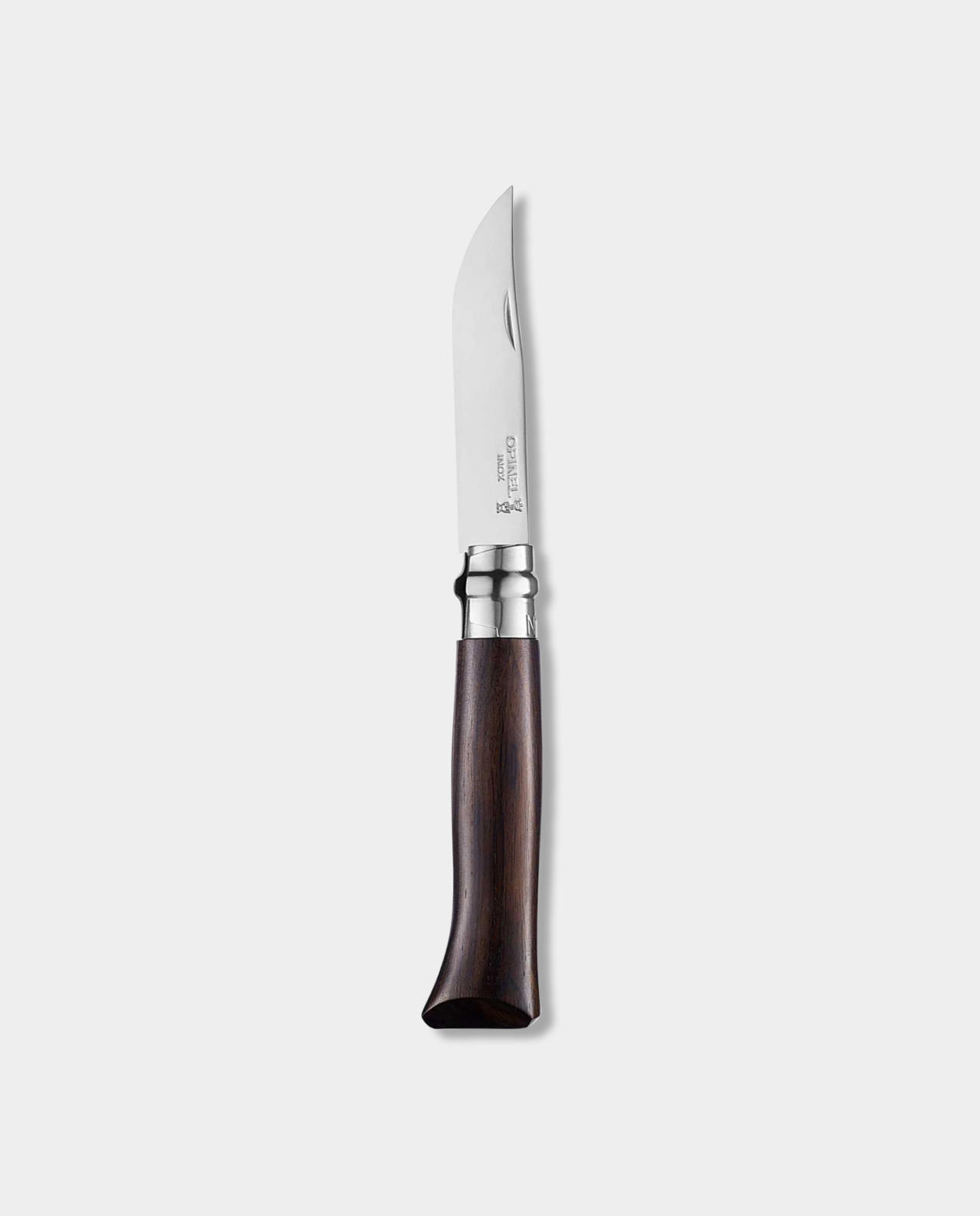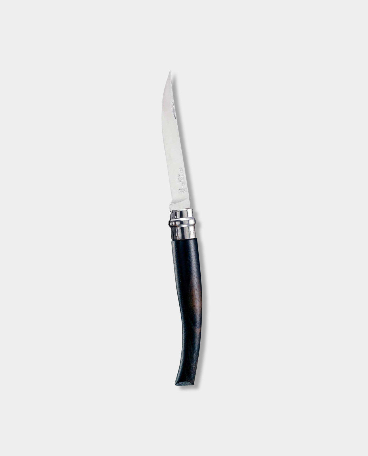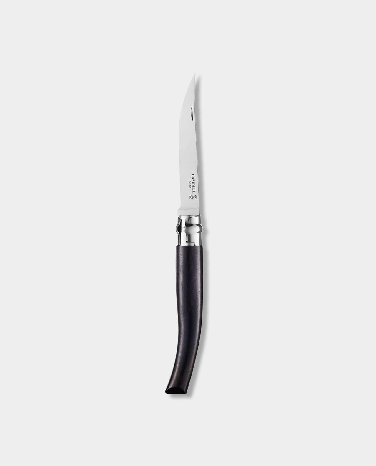 Eine Erweiterung des Sortiments der stilvollen Opinel Slim-Line-Serie stellt dieses Modell der Größe 10 mit einem Griff aus dunklem Ebenholz dar. Wie bei Messern dieses Typs gewohnt, lässt sich die Klinge aus rostfreiem Edelstahl über das für Opinel typische Virobloc-System zuverlässig feststellen. Die Lieferung erfolgt in einer Geschenkbox.