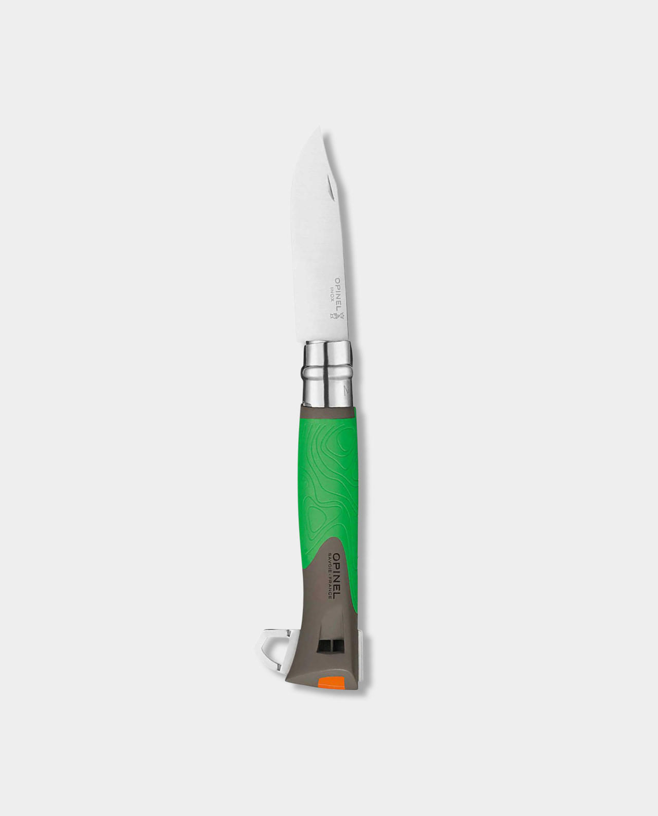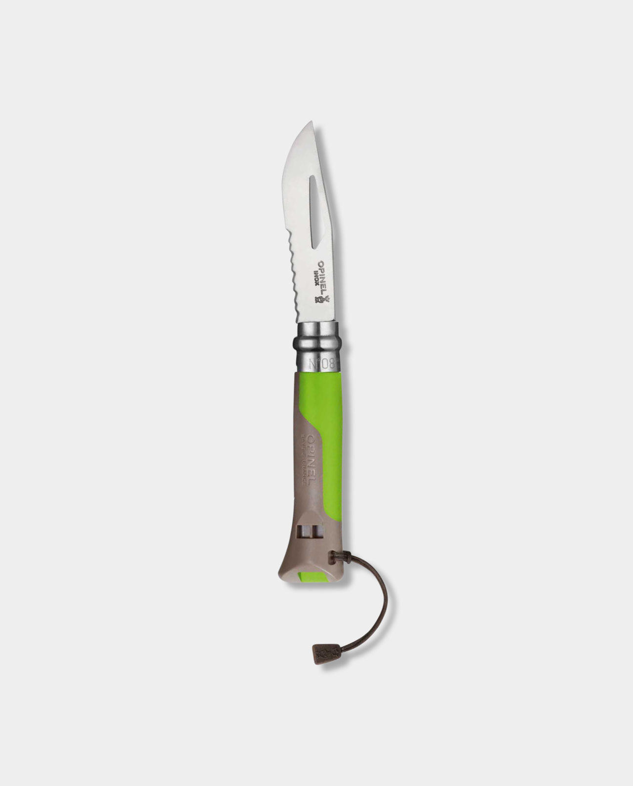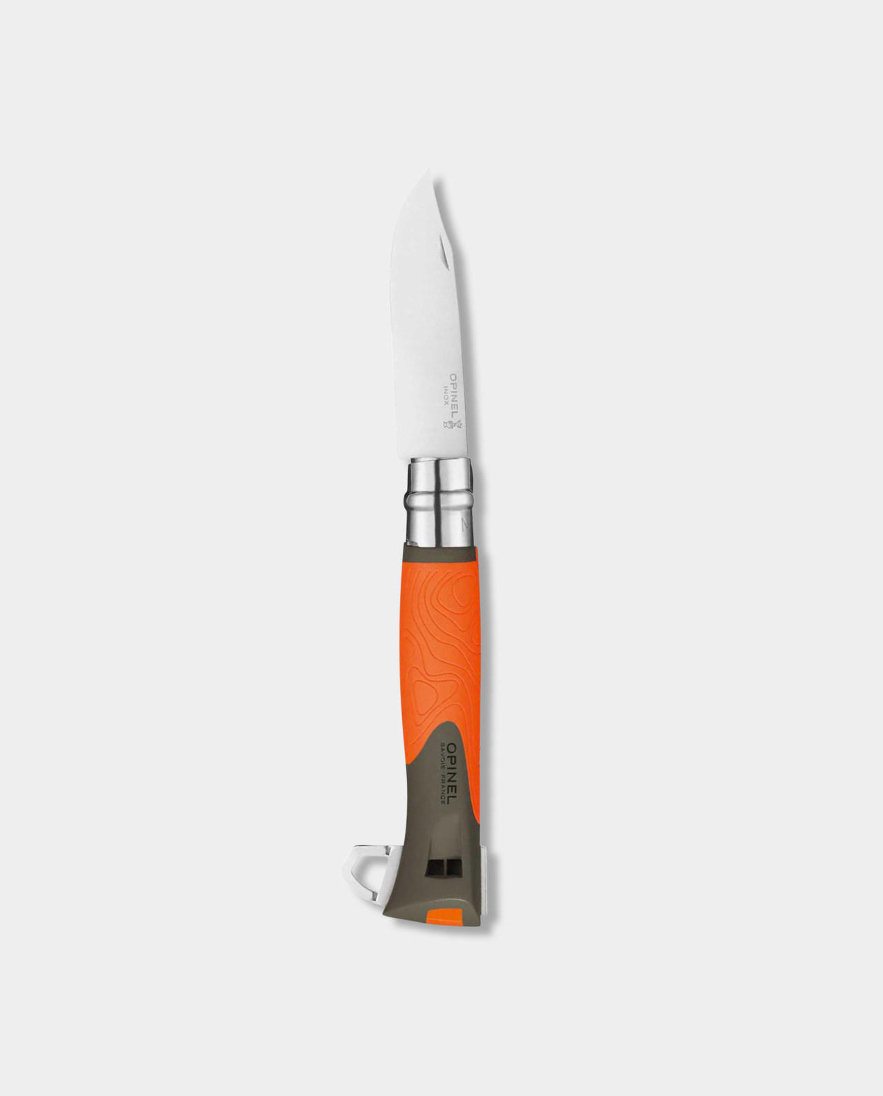 Mit dem Opinel No. 8 Outdoor präsentiert der französische Hersteller ein robustes, vielseitig einsetzbares Taschenmesser. Für die Klinge wird ein 2,5 mm starker, rostfreier Sandvik-Stahl 12C27 verwendet. Die mit Teilsägezahnung und Schäkelöffner ausgestattete Klinge wird durch das bewährte Virobloc-System sicher arretiert. Der orange-graue Griff aus einer Polyamid-/Fiberglas-Kombination präsentiert sich in der ergonomischen Form der Opinel-Messer. In den Griff ist eine Signalpfeife integriert mit der sich ein weithin hörbarer Ton erzeugen lässt. Eine Kunststoff-Kordel ermöglicht das Befestigen des Messers an vielen Stellen.