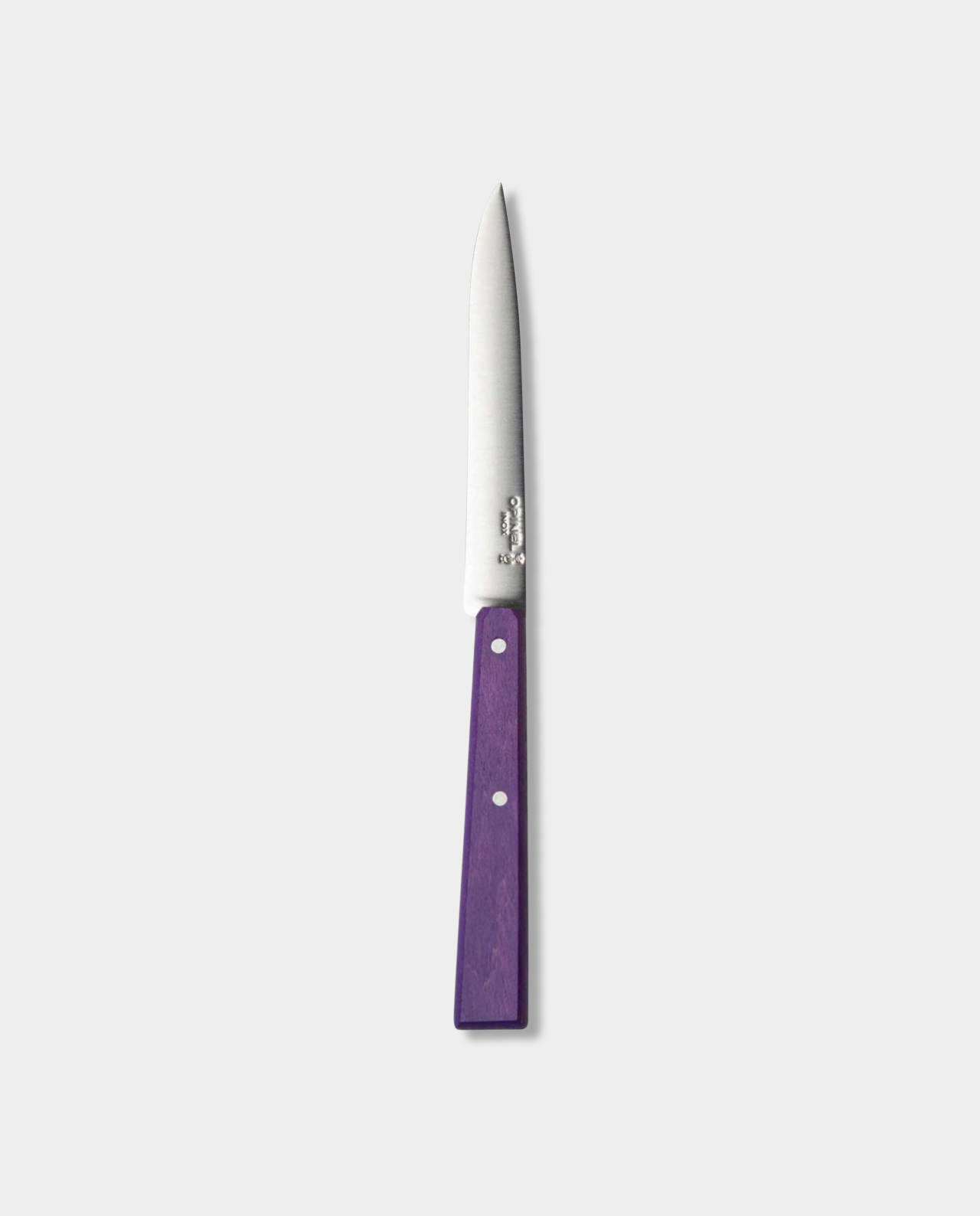Tafelmesser aus der Opinel Messerserie Bon Appétit POP SPIRIT. Die 11 cm lange, glatte Klinge ist aus rostfreiem Stahl 12C27 gefertigt. Damit die Qualität erhalten bleibt, sollte das Messer nur von Hand gereinigt werden. Grifffarbe: violett