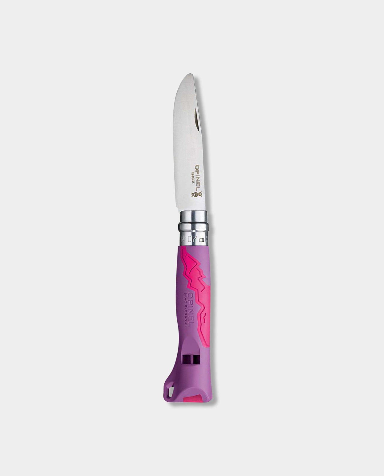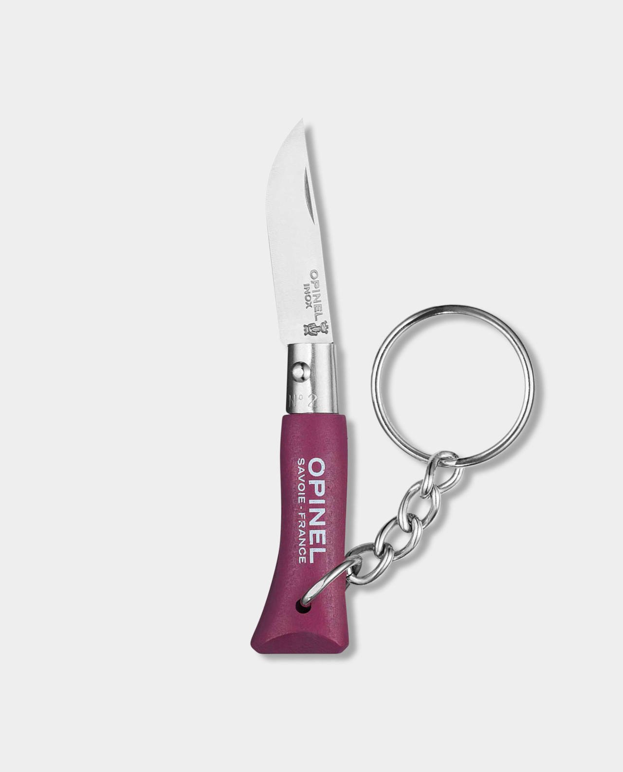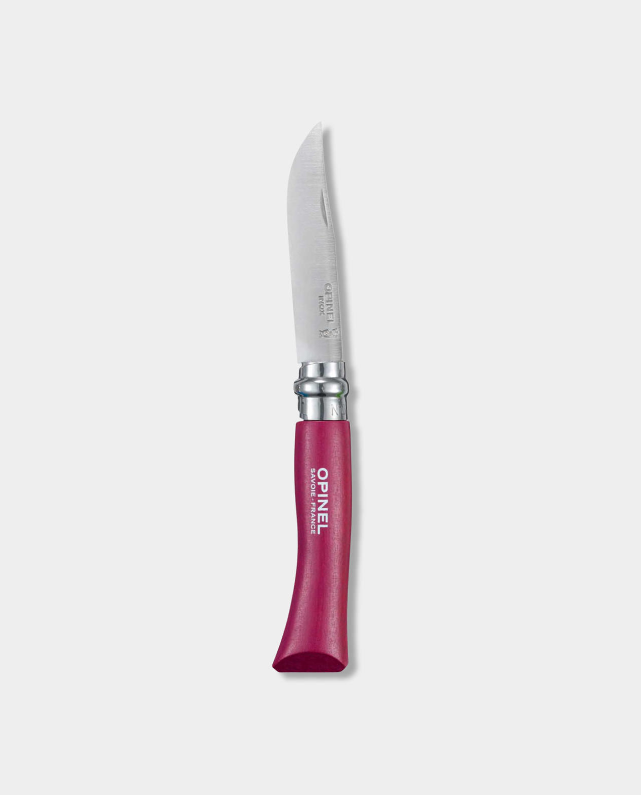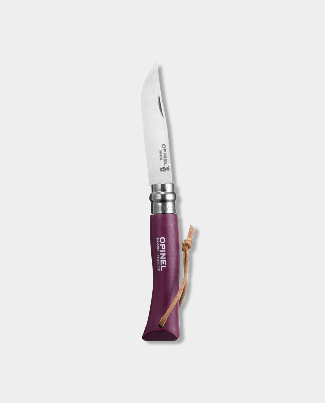 Opinel mal farbig. Neben den klassischen Holztönen bietet Opinel-Messer in modernen Farben an, so wie dieses Modell in einem kräftigen Violett. Das Messer aus Hartholz ist mit einer rostfreien Klinge versehen, die über den Opinel-typischen Sicherungsring festgestellt werden kann.