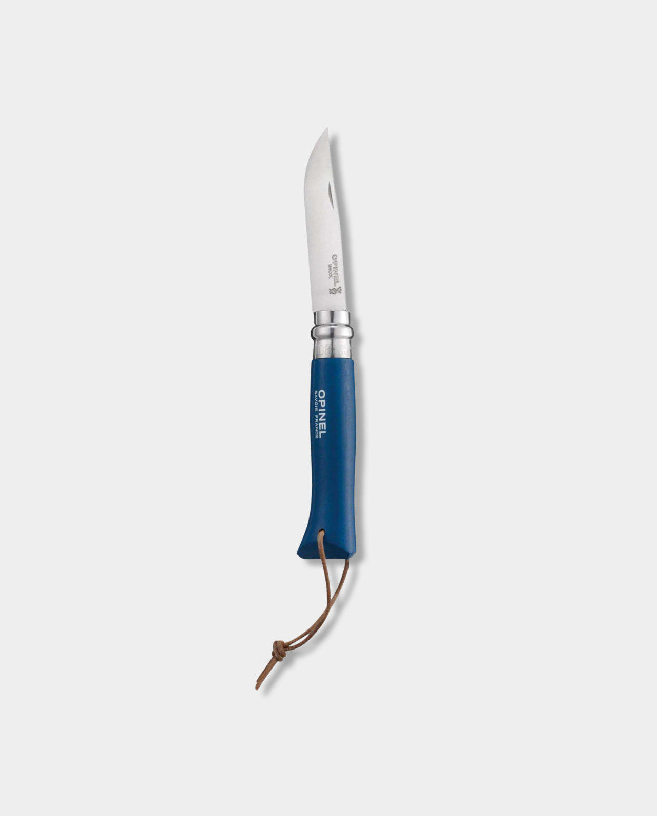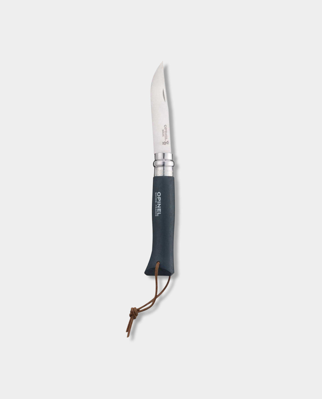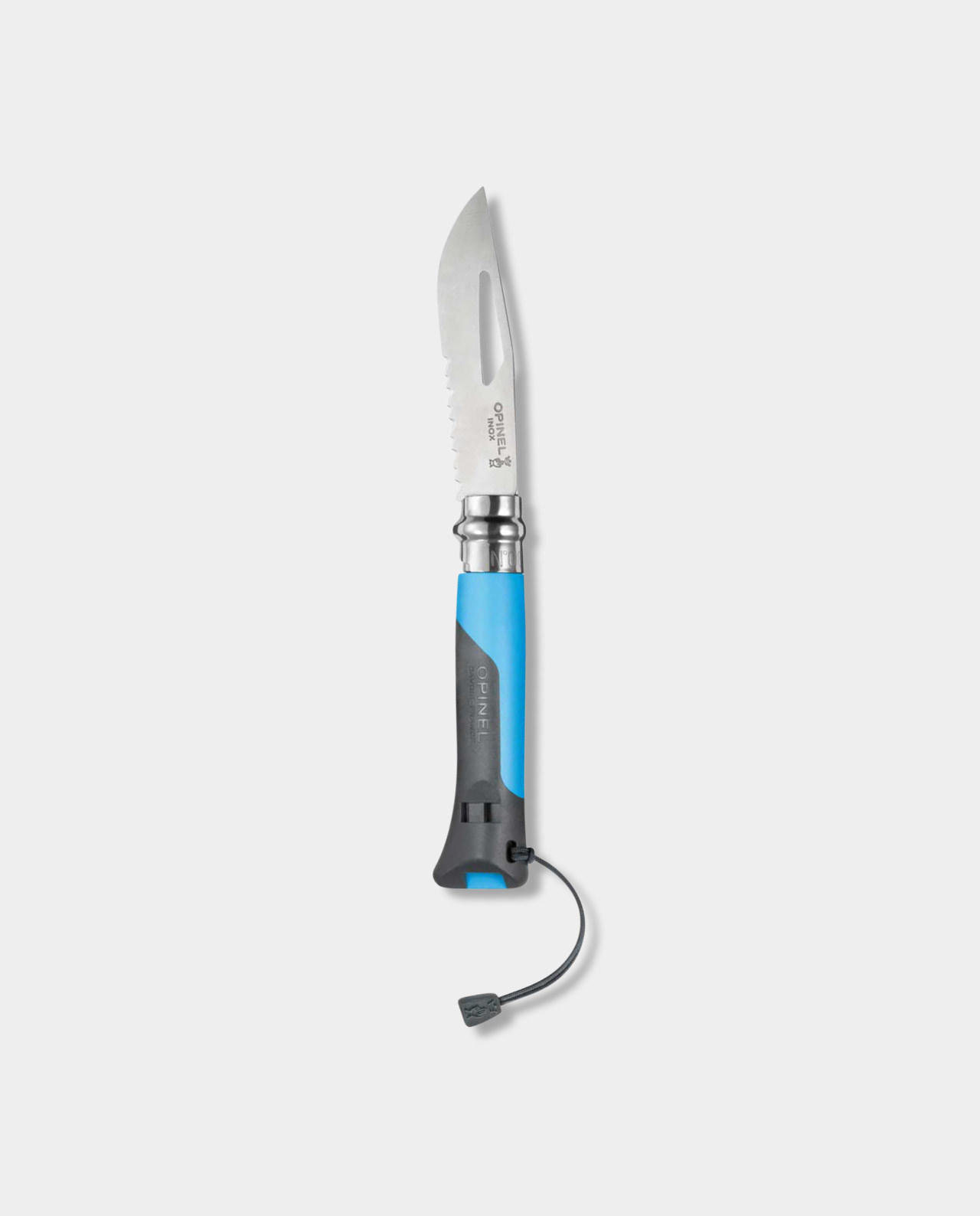 Das Opinel No. 8 Outdoor bietet vielseitige Einsatzmöglichkeiten. Die 2,5 mm starke Klinge besteht aus modifiziertem, rostfreien Sandvik-Stahl 12C27. Die 3,5 cm breite Teilsägezahnung erlaubt ein leichtes Durchtrennen von Natur- und synthetischen Seilen. Über den in die Klinge integrierten Schäkelöffner werden sich die Segler freuen. Das Virobloc-System arretiert die Klinge sicher im geöffneten und geschlossenen Zustand. Der grau-blaue Griff im typischen Opinel-Design wird aus einem Polyamid-/Fiberglas-Material gefertigt, das selbst mit nassen Händen gut und fest in der Hand liegt. Eine in den Griff integrierte Signalpfeife und eine Kunststoff-Kordel runden die umfangreiche Ausstattung ab.