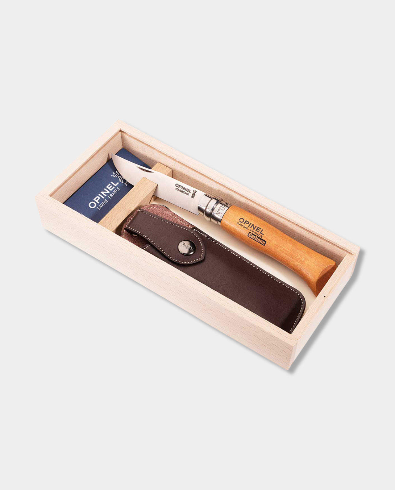 Opinel-Messer mit einer Klinge aus rostfreiem Stahl. Der aus einem Stück gefertigte Griff ist aus Buchenholz, das durch eine Speziallackierung vor Feuchtigkeit geschützt wird. Natürlich auch mit dem einzigartigen Virobloc-System, mit dem sich die Klinge blitzschnell arretieren lässt. Um die Klinge festzustellen, muss nur der Sicherungsring gedreht werden. Inklusive robustem Kunstlederetui mit Druckknopf und Karabinerhaken.