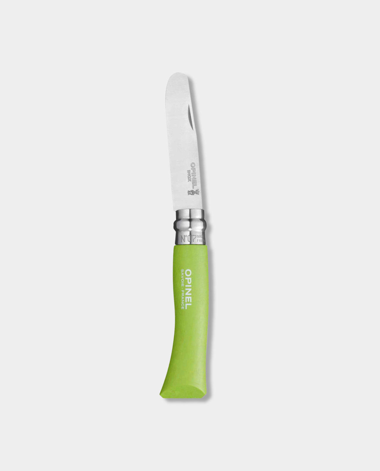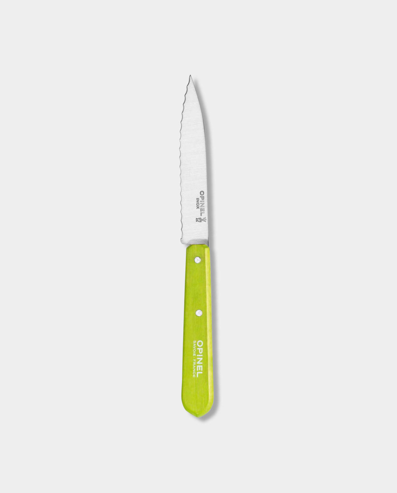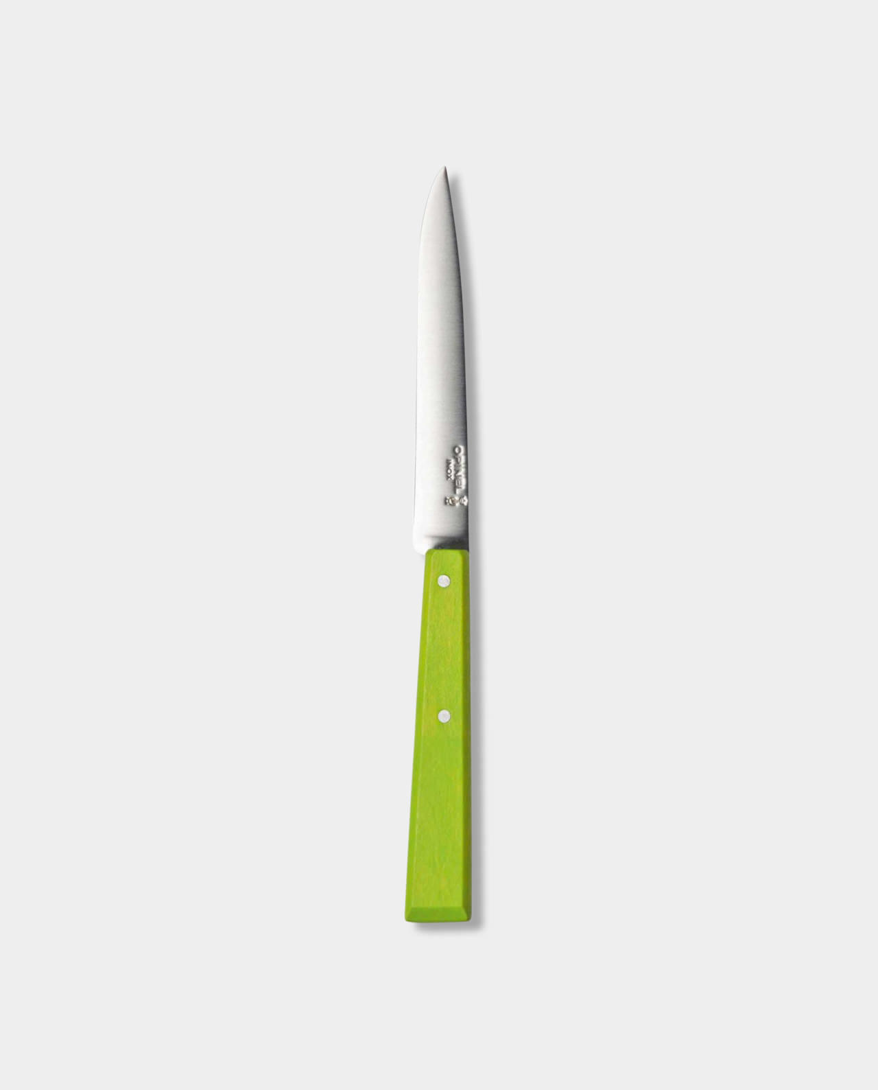 Tafelmesser aus der Opinel Messerserie Bon Appétit POP SPIRIT. Die 11 cm lange, glatte Klinge ist aus rostfreiem Stahl 12C27 gefertigt. Damit die Qualität erhalten bleibt, sollte das Messer nur von Hand gereinigt werden. Grifffarbe: grün