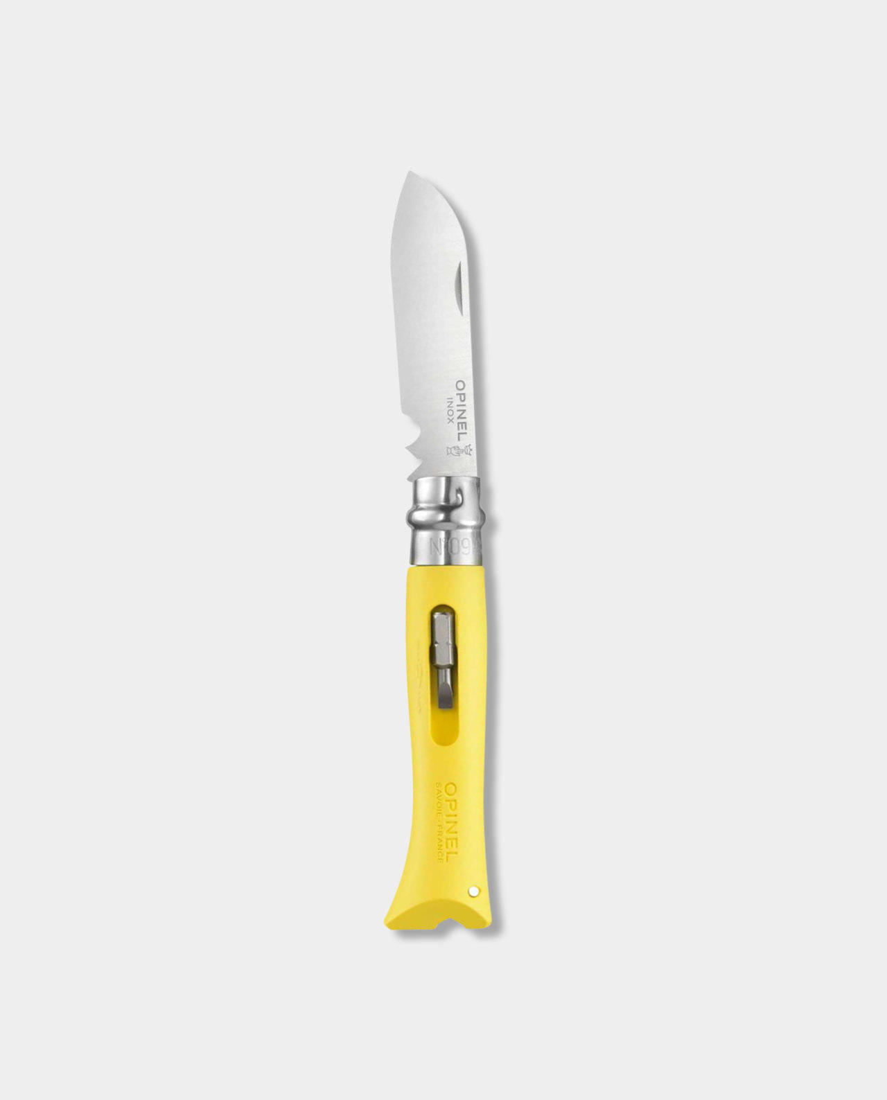 Opinel erweitert mit dem multifunktionalen Messer OPINEL No. 9 DIY sein erfolgreiches Sortiment. Das Messer ist die ideale Ergänzung im Werkzeugkoffer, im PKW oder auch im Büro. Das Messer verfügt über eine robuste 8 cm lange Klinge aus modifiziertem Sandvik 12C27 Stahl, die an der Klingenbasis durch einen Abisolierer und einen Fadenschneider ergänzt wurde. Die Klinge wird durch den Virobloc-Sicherheitsring arretiert. Der gelbe Griff des OPINEL No. 9 DIY aus glasfaserverstärktem Polyamid beherbergt in zwei Griffaussparungen je ein Bit für Schlitzkopf- und Kreuzschlitzschrauben. Damit kann das Messer als Schraubendreher verwendet werden, indem das passende Bit in den am Griffende angebrachten magnetischen Bithalter eingesetzt wird. Verwendet werden handelsübliche Bits.