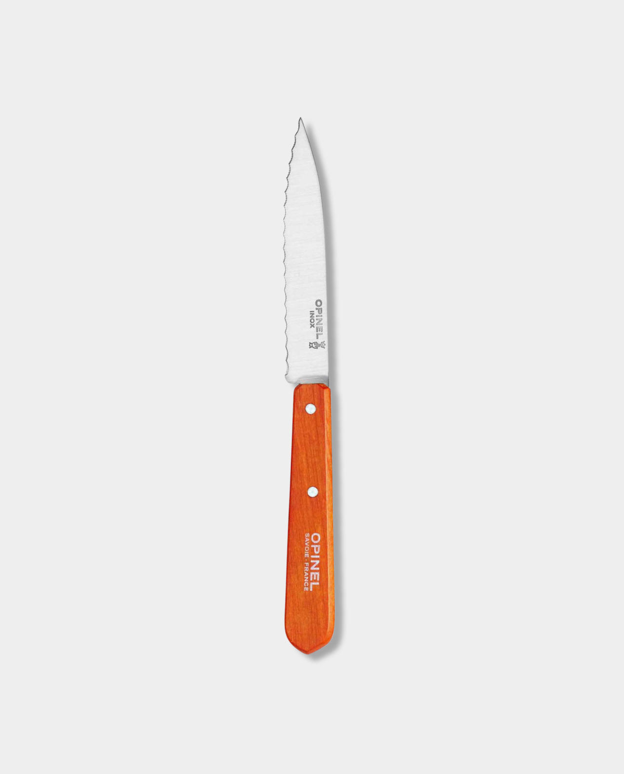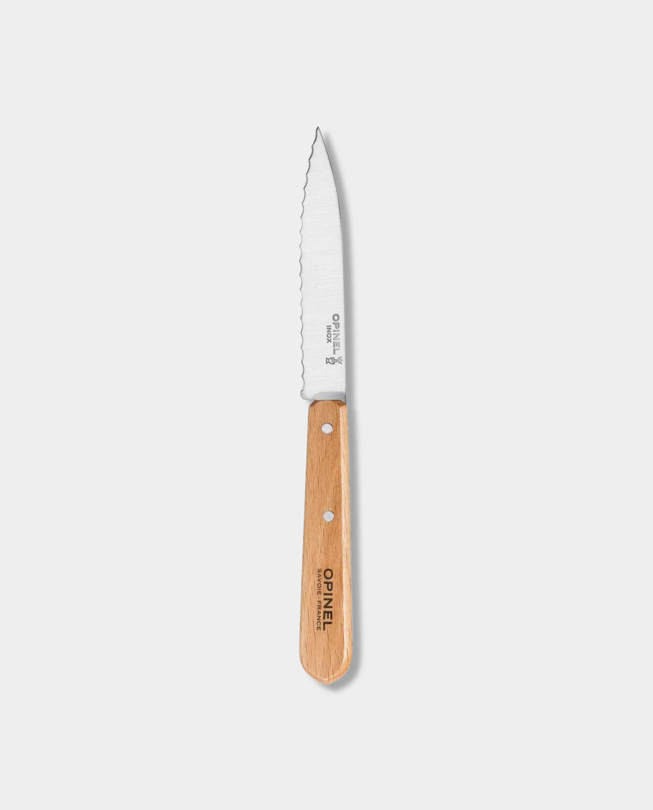 Das Opinel Schälmesser No. 115 ist auf der Klingenrückseite mit einer feinen Sägezahnung versehen. Damit lassen sich Tomaten und Kiwis schnell und effizient schälen. Die doppelte Klinge aus rostfreiem Edelstahl ermöglicht die Verwendung für Rechts- und Linkshänder. Aufgrund des Griffs aus rosafarbenem Buchenholz sollte das Messer nicht in der Spülmaschine gereinigt werden.