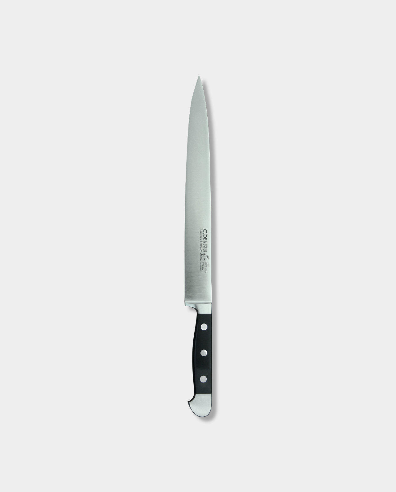 Diese scharfe und schlanke Klinge schneidet problemlos Fleisch wie Schinken und Braten in präzise, dünne Scheiben und reduziert das Auslaufen von schmackhaftem Bratensaft. Auch große Stücke sind für das Tranchiermesser und seine Schärfe kein Problem.