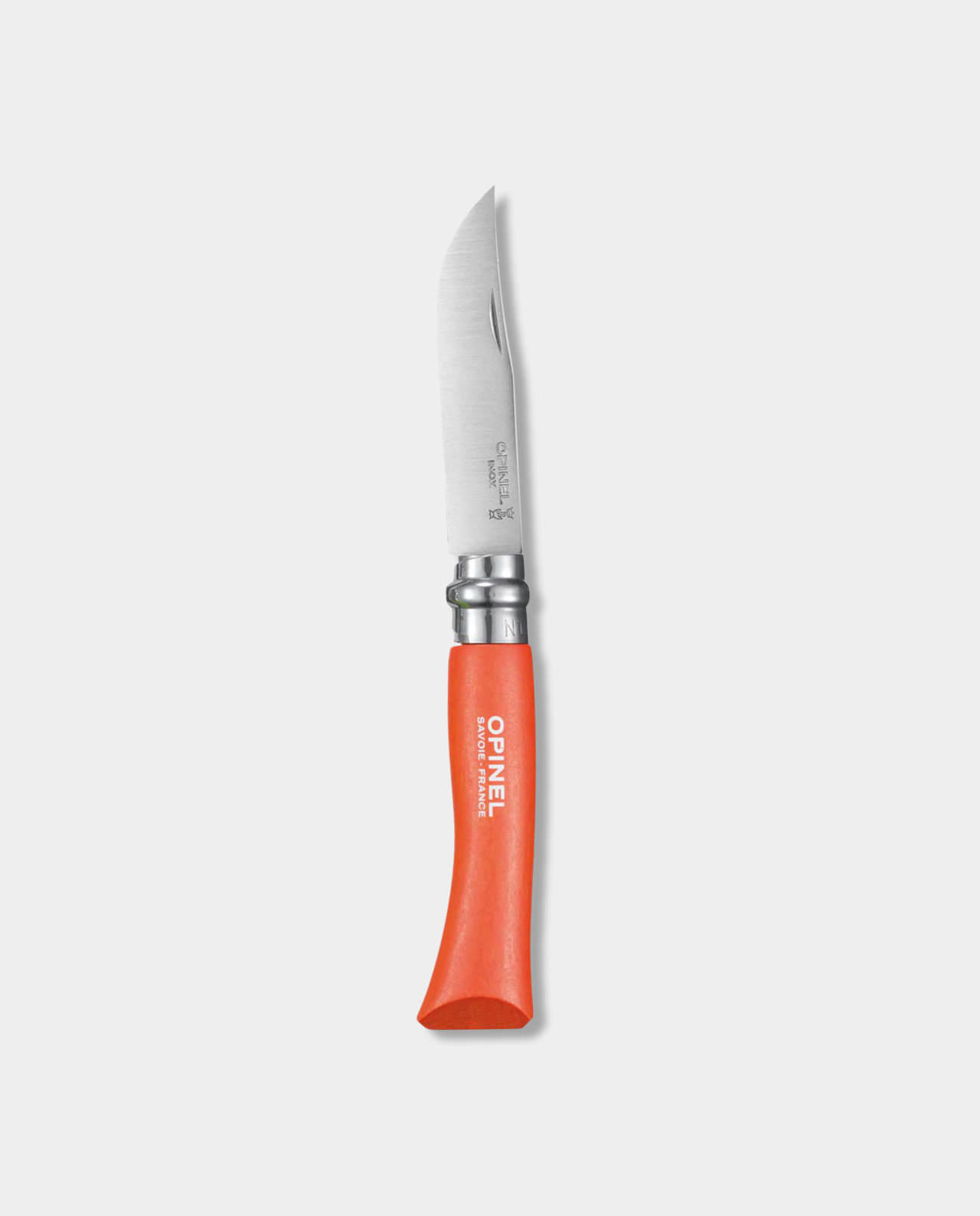 Opinel bekennt Farbe und präsentiert dieses Opinel-Messer in zeitgemäßem Orange. Die Ausstattung ist typisch Opinel mit einem Griff aus getrocknetem Hartholz und einer rostfreien Klinge, die sich mittels eines Sicherungsrings feststellen lässt.