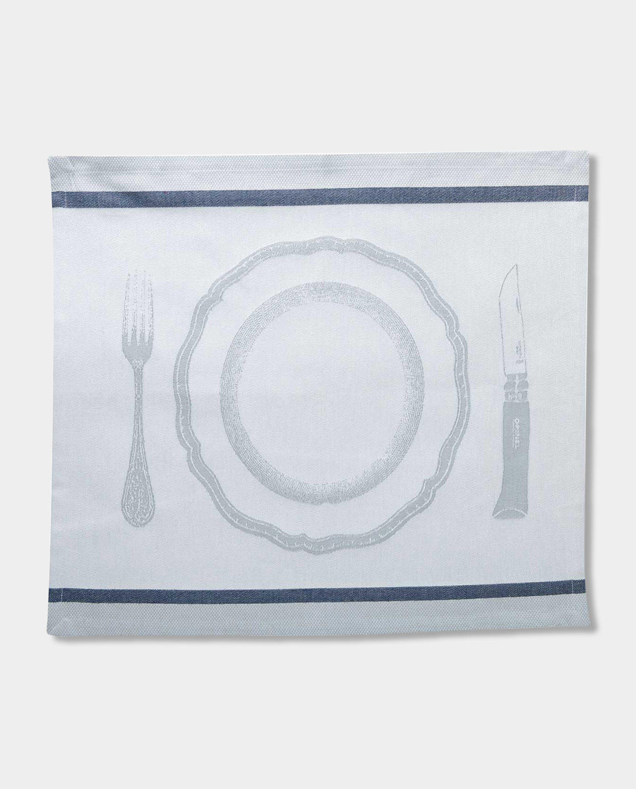 Opinel Platzset im hellblauen Design. Maße: 40 x 50 cm. 55% Baumwolle, 45% Polyester, Teller-Besteck-Motiv. Kann bei 40° gewaschen werden.