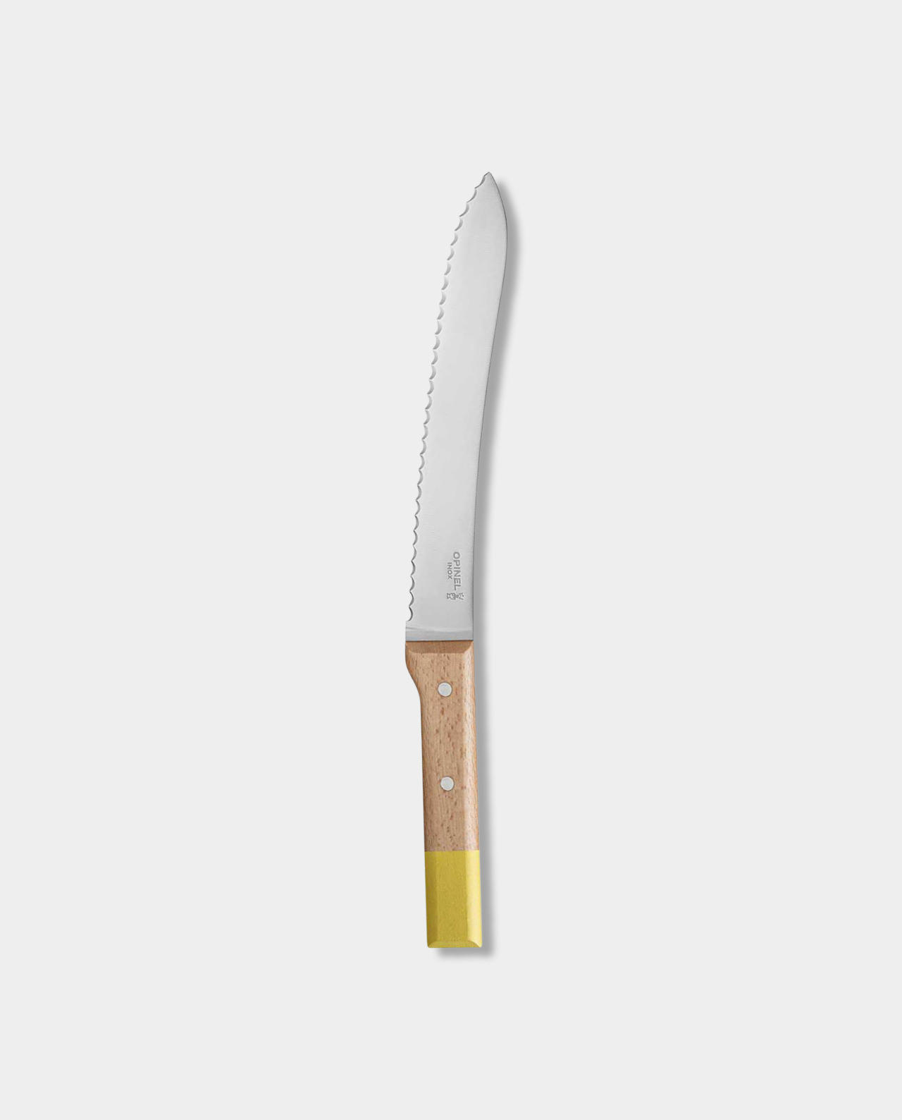 Bei diesem Brotmesser aus der Parallele POP Collection von Opinel sorgt die Klinge mit einem besonders scharfen Wellenschliff für einen sauberen Schnitt. Die Klinge besteht aus rostfreiem Sandvik-Stahl, der Griff aus naturfarbenem, lackiertem Buchenholz mit farbigem Akzent.