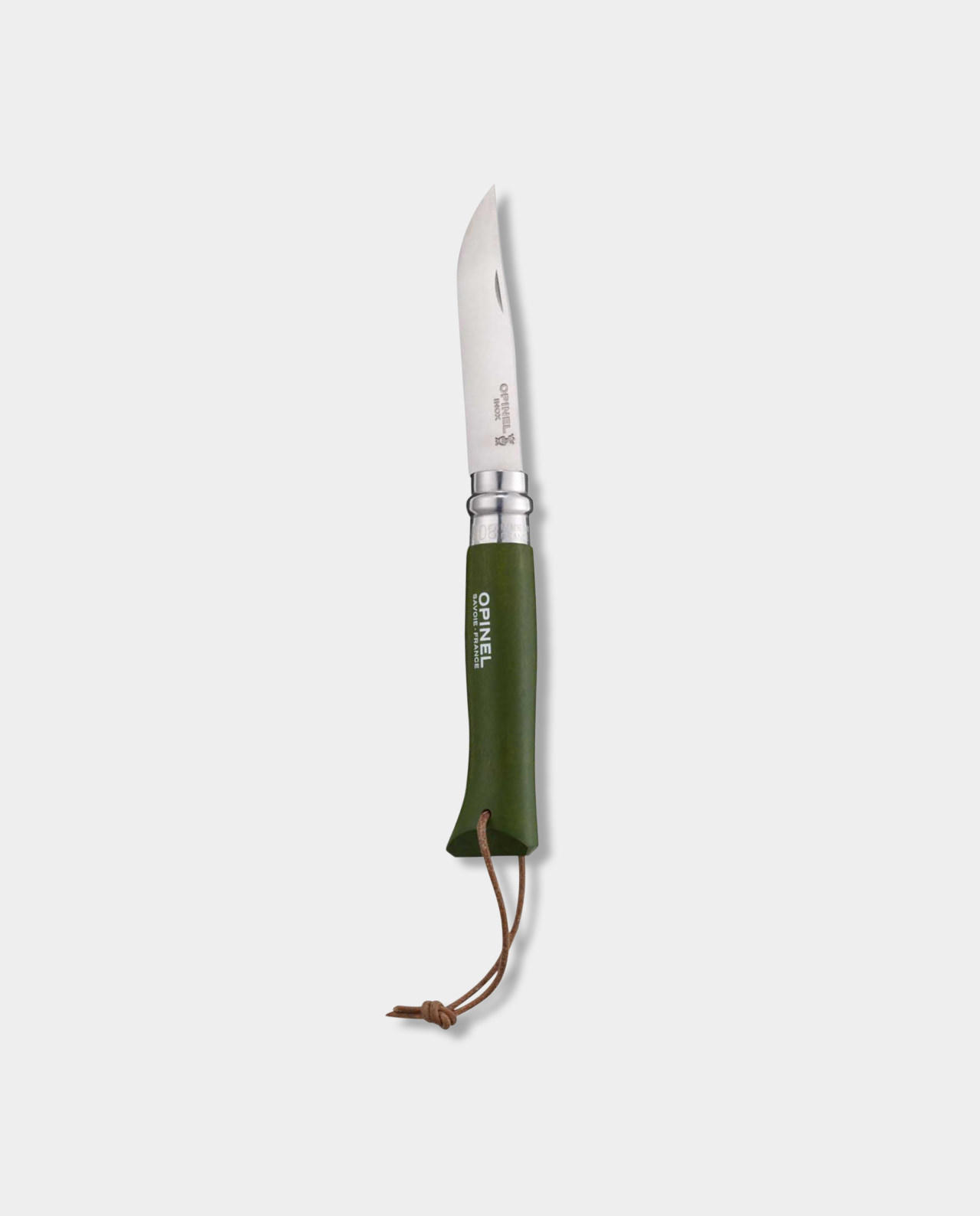 Opinel-Messer Größe 08 aus der Serie 08 COLORAMA EARTH. Als Grundlage dient ein reguläres Modell No. 08 mit rostfreier Klinge aus modifiziertem 12C27 Sandvik-Stahl. Das Virobloc-System sichert die Klinge vor ungewolltem Öffnen und Einklappen bei der Arbeit. Zum Befestigen an Gürtel, Schlüsselbund oder auch einem Karabiner ist am Griff aus Buchenholz eine Lederkordel angebracht. Griffarbe: khaki