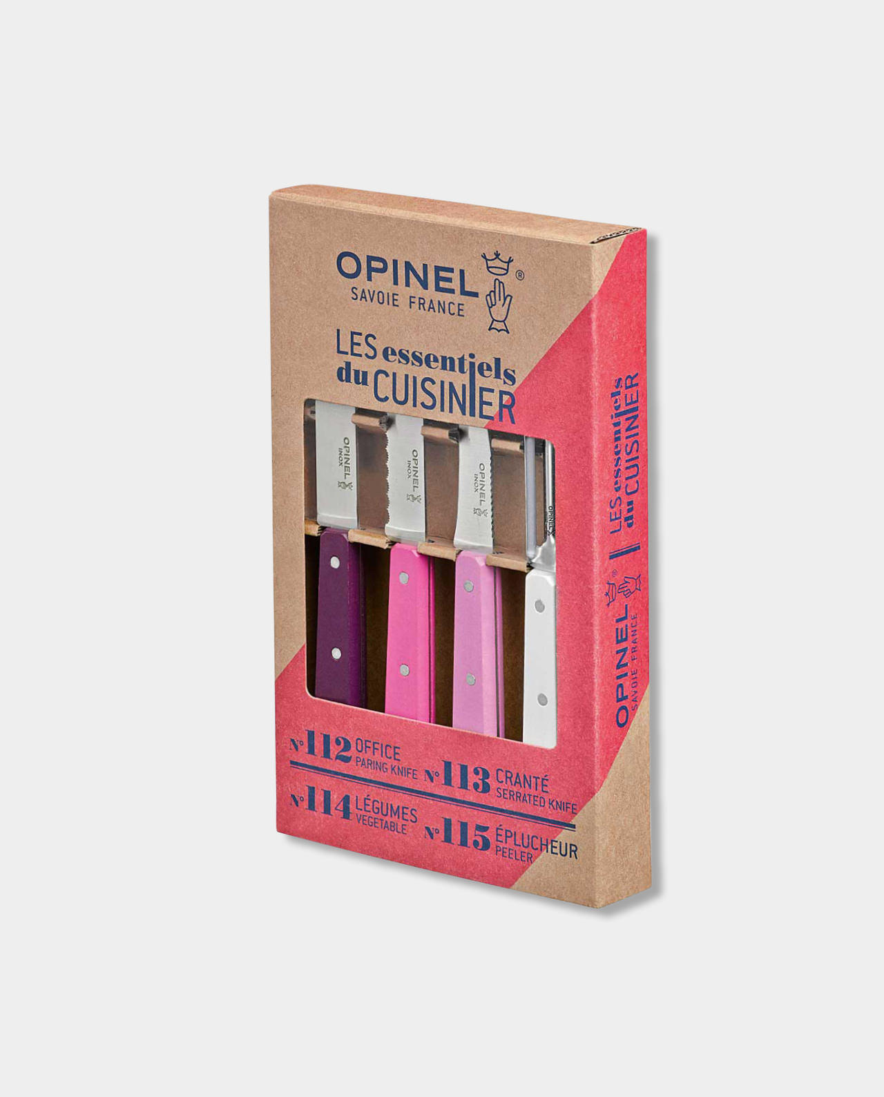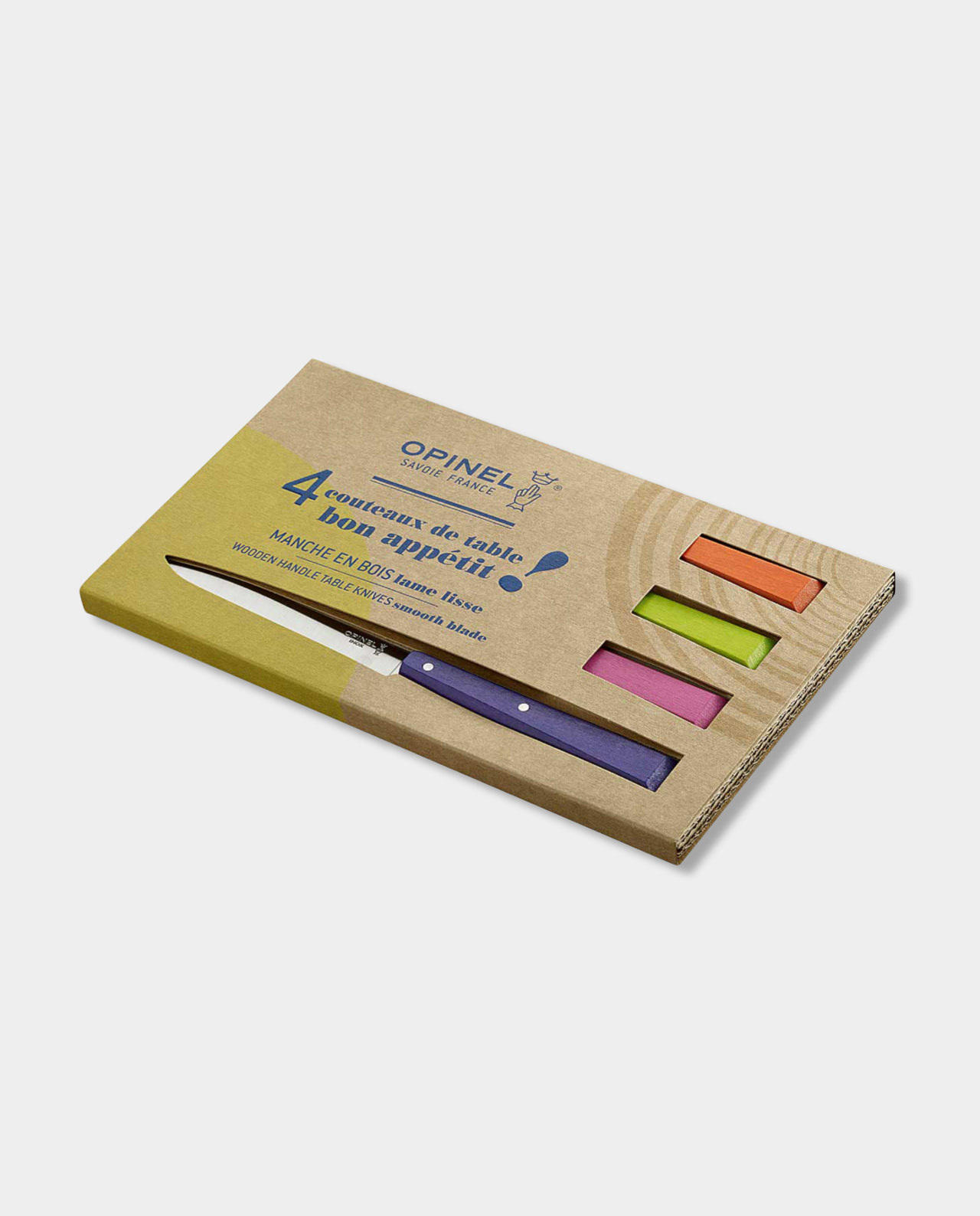 Opinel wünscht Bon Appétit mit diesem farbenfrohen Messersatz POP SPIRIT aus dergleichnamigen Serie von Tafelmessern. Die 11 cm lange, glatte Klinge ist ausrostfreiem Stahl 12C27 gefertigt. Ein Satz beinhaltet 4 Messer in den Farben violett, pink, grün und orange. Damit die Qualität erhalten bleibt, sollten die Messer nur von Hand gereinigt werden.
