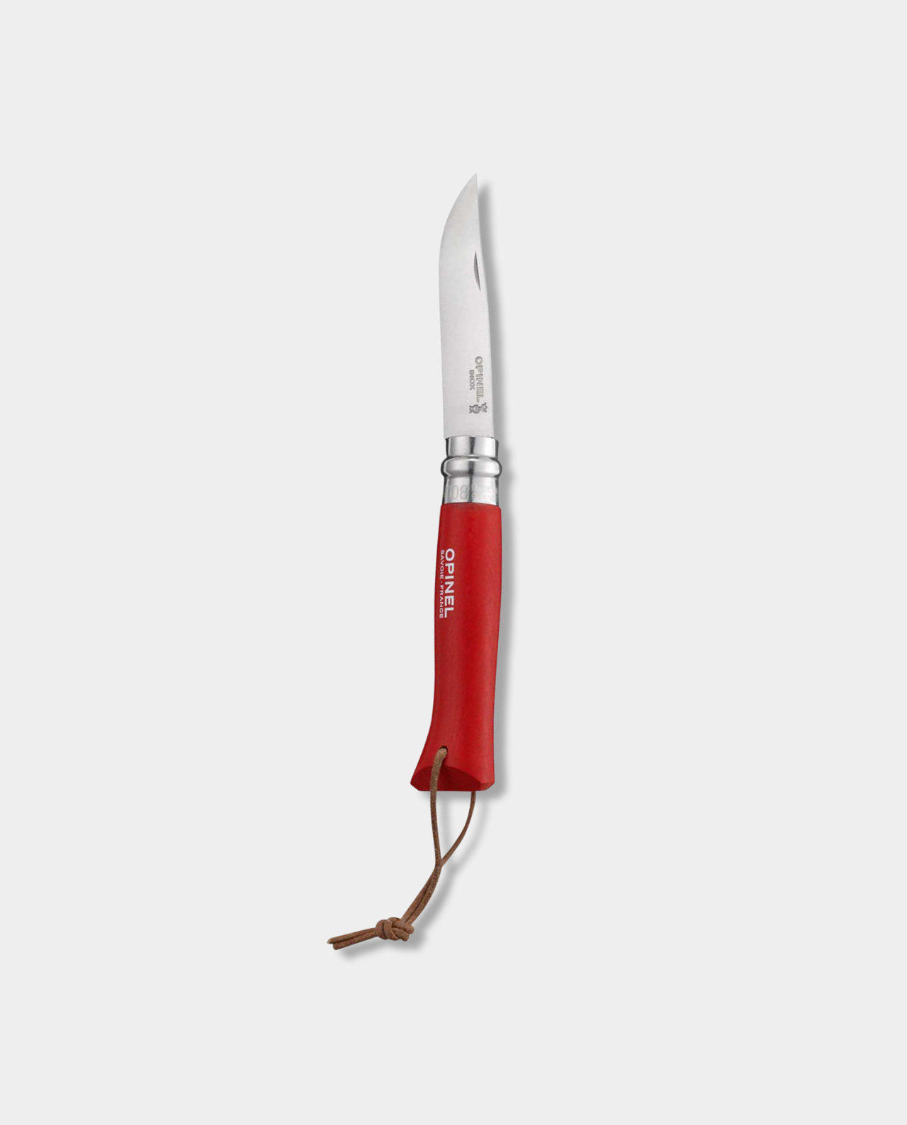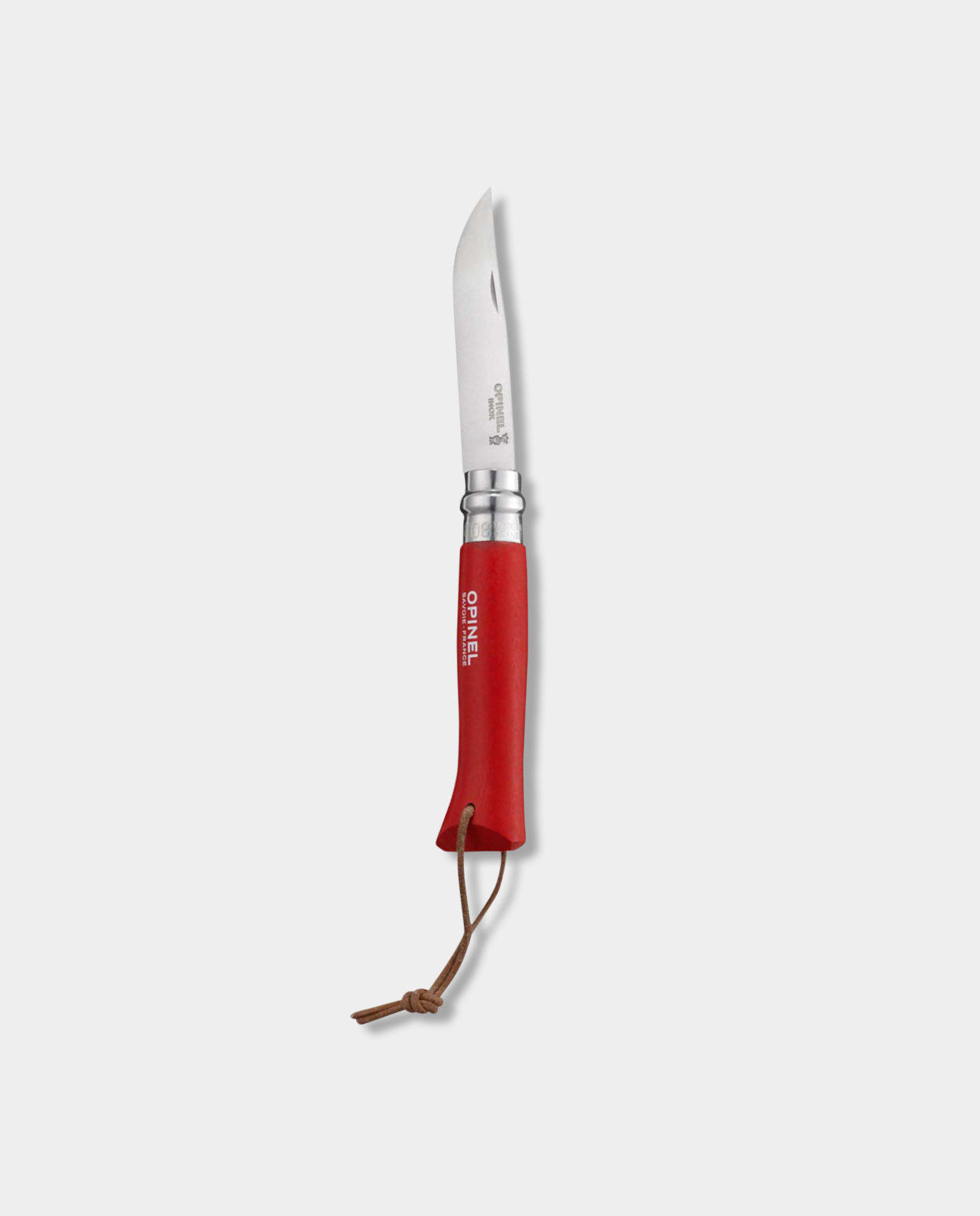 Opinel-Messer Größe 08 aus der Serie 08 COLORAMA EARTH. Als Grundlage dient ein reguläres Modell No. 08 mit rostfreier Klinge aus modifiziertem 12C27 Sandvik-Stahl. Das Virobloc-System sichert die Klinge vor ungewolltem Öffnen und Einklappen bei der Arbeit. Zum Befestigen an Gürtel, Schlüsselbund oder auch einem Karabiner ist am Griff aus Buchenholz eine Lederkordel angebracht. Griffarbe: rot