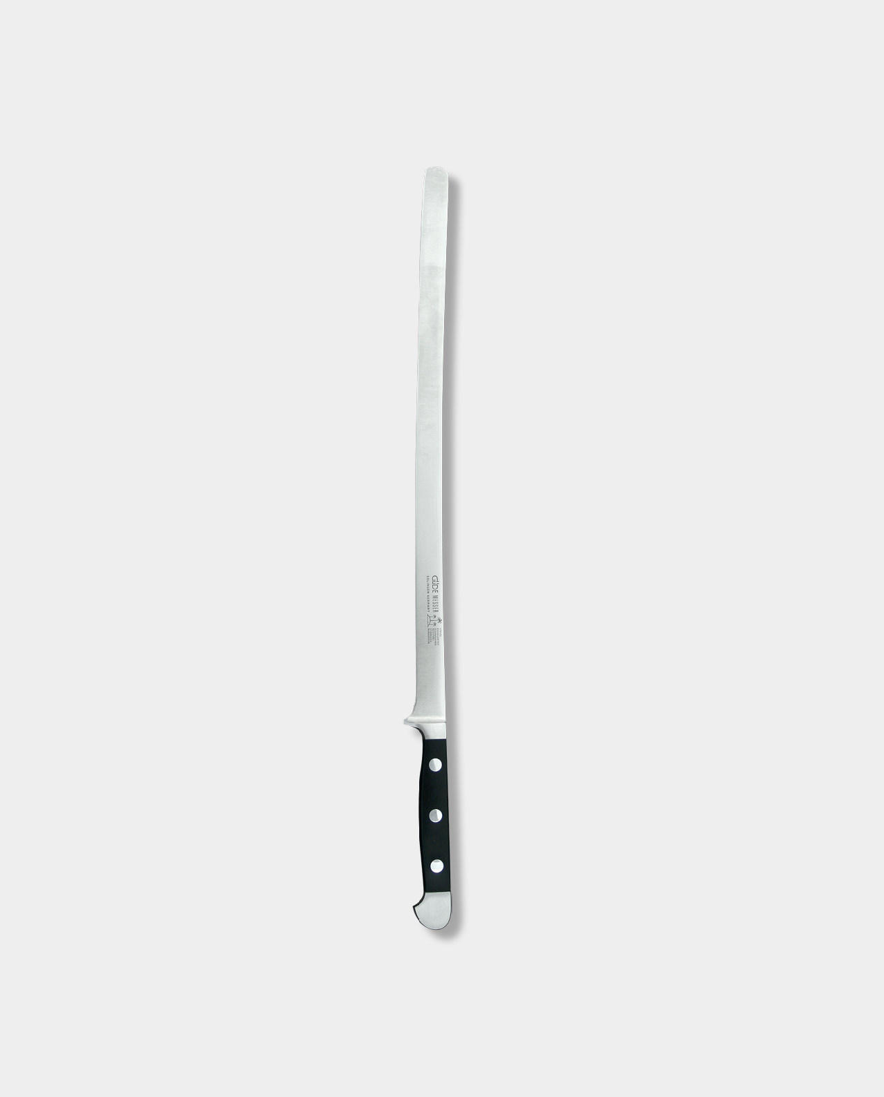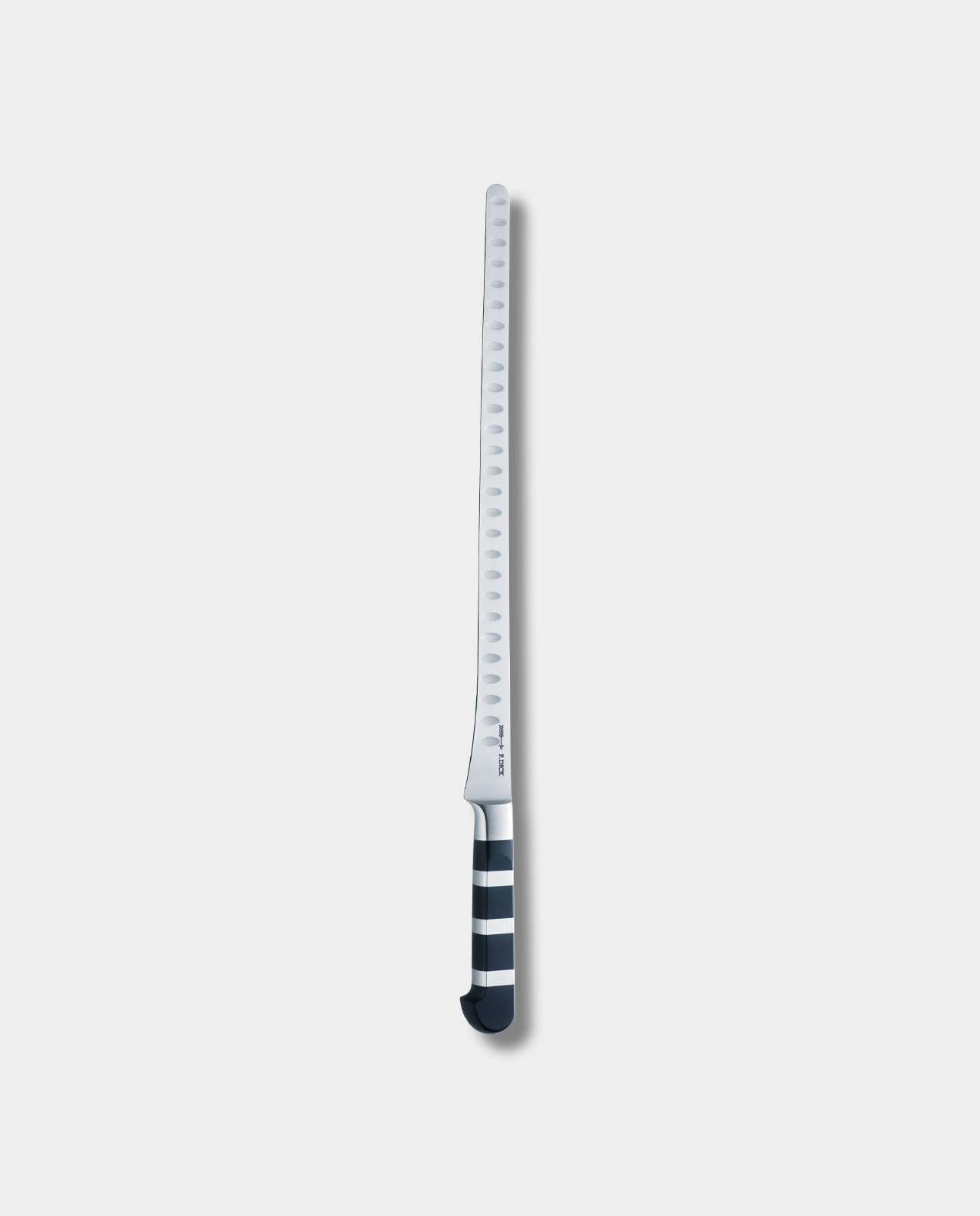 Ob Serano-, Iberico oder Parmaschinken: die flexible Klinge des Schinkenmessers gleitet mühelos, leicht und sicher durch den Schinken. Das einfache Führen der Messerklinge erleichtert das Schneiden von hauchdünnen und leckeren Schinkenscheiben, denn nur bei dünnen Scheiben kommt der Geschmack des Schinkens perfekt zur Geltung. Die flexible Klinge legt sich dabei direkt an den Knochen an und trennt das beste Knochenfleisch optimal ab. Lachsmesser werden – wie der Name schon sagt – für die Vorbereitung von Lachs eingesetzt. Das Messer ist das optimale Werkzeug um die Haut des Fischs vom Fleisch zu trennen und hauchdünne Scheiben zu schneiden. Schinkenmesser und auch Lachsmesser sind mit dem besonderen Kullenschliff ausgestattet. Das Luftpolster der Kullen reduziert das Anhaften des Schneidguts an der Klinge.