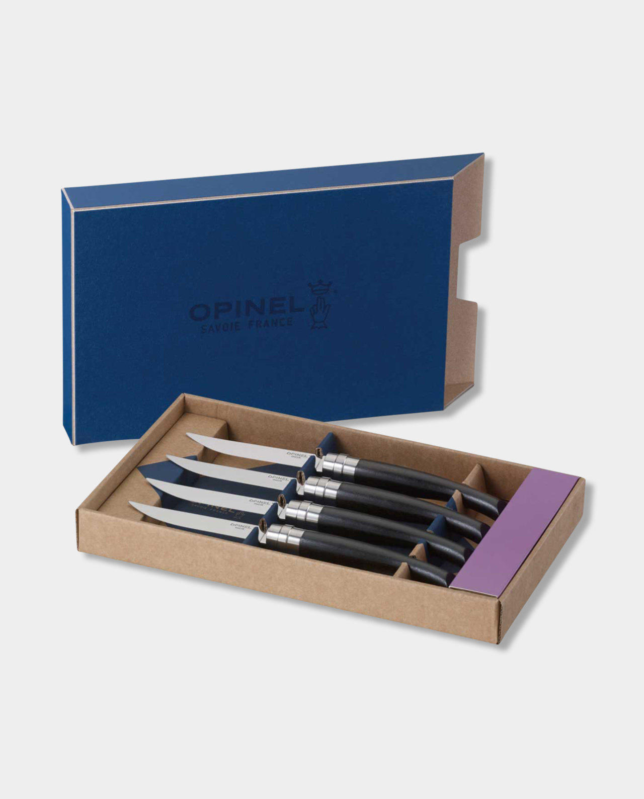 Dass die Kombination von Ebenholz mit einer hochglanzpolierten Klinge aus rostfreiem Stahl für ein dekoratives Erscheinungsbild sorgt, bewies Opinel bereits mit zahlreichen Taschenmesser-Modellen. In diesem Fall wurden die Materialien für einen Satz Steakmesser aus der Table Chic Serie verarbeitet. Die optisch an Slim Line Modelle angelehnte Serie wird im Set zu 4 Stück angeboten.