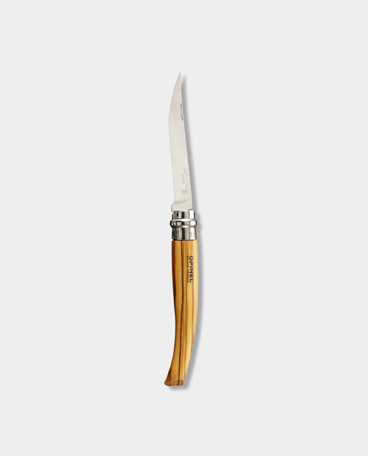 Elegantes Modell aus der Slim-Line von Opinel. Das ergonomisch geformte Messer ist mit einem schön gemaserten Olivenholz-Griff versehen und eignet sich vor allem für schmale Hände. Mit dem bewährten Opinel-Sicherungsring kann die rostfreie Klinge nach dem Öffnen bequem festgestellt werden.