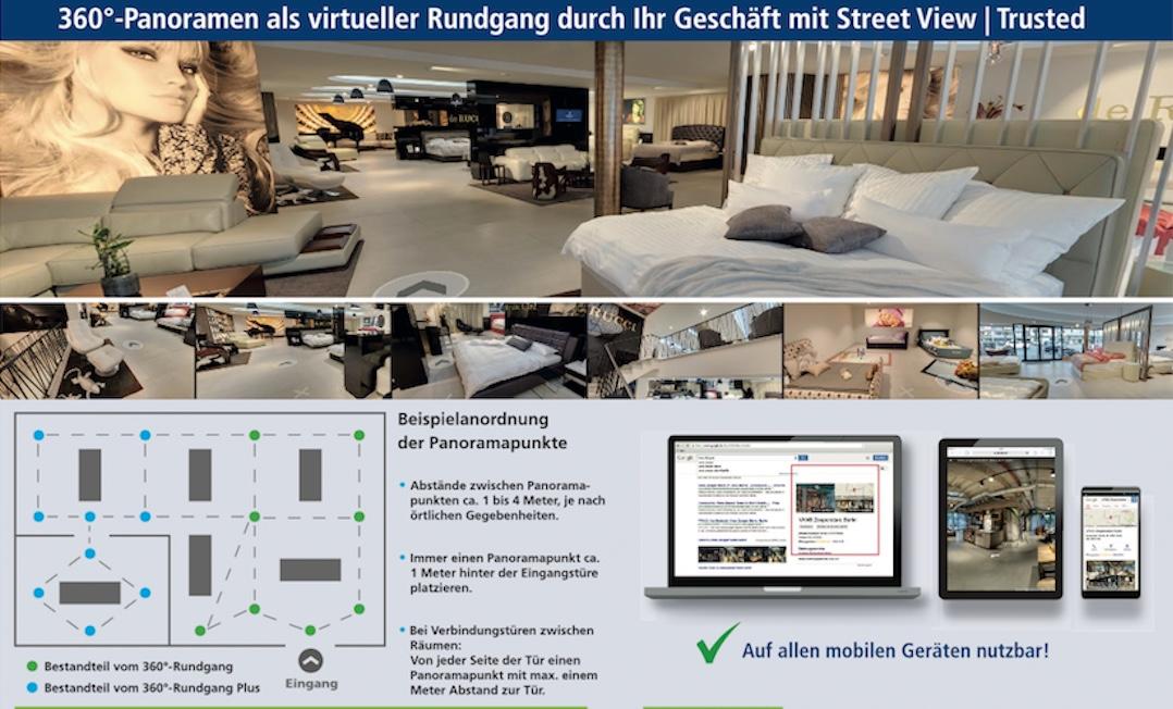 Optimale Darstellung Ihrer Geschäftsräume durch einen 360° Rundgang. Virtueller Rundgang durch Ihre Räumlichkeiten mit hochwertigen 360°-Panoramaaufnahmen sowie POI-Fotos von unseren von Google zertifizierten Fotografen. Einbindung des Panoramarundgangs in Ihrem Google My Business Profil und auf Ihrer Website, unverzichtbar für ein modernes Internet-Marketing.