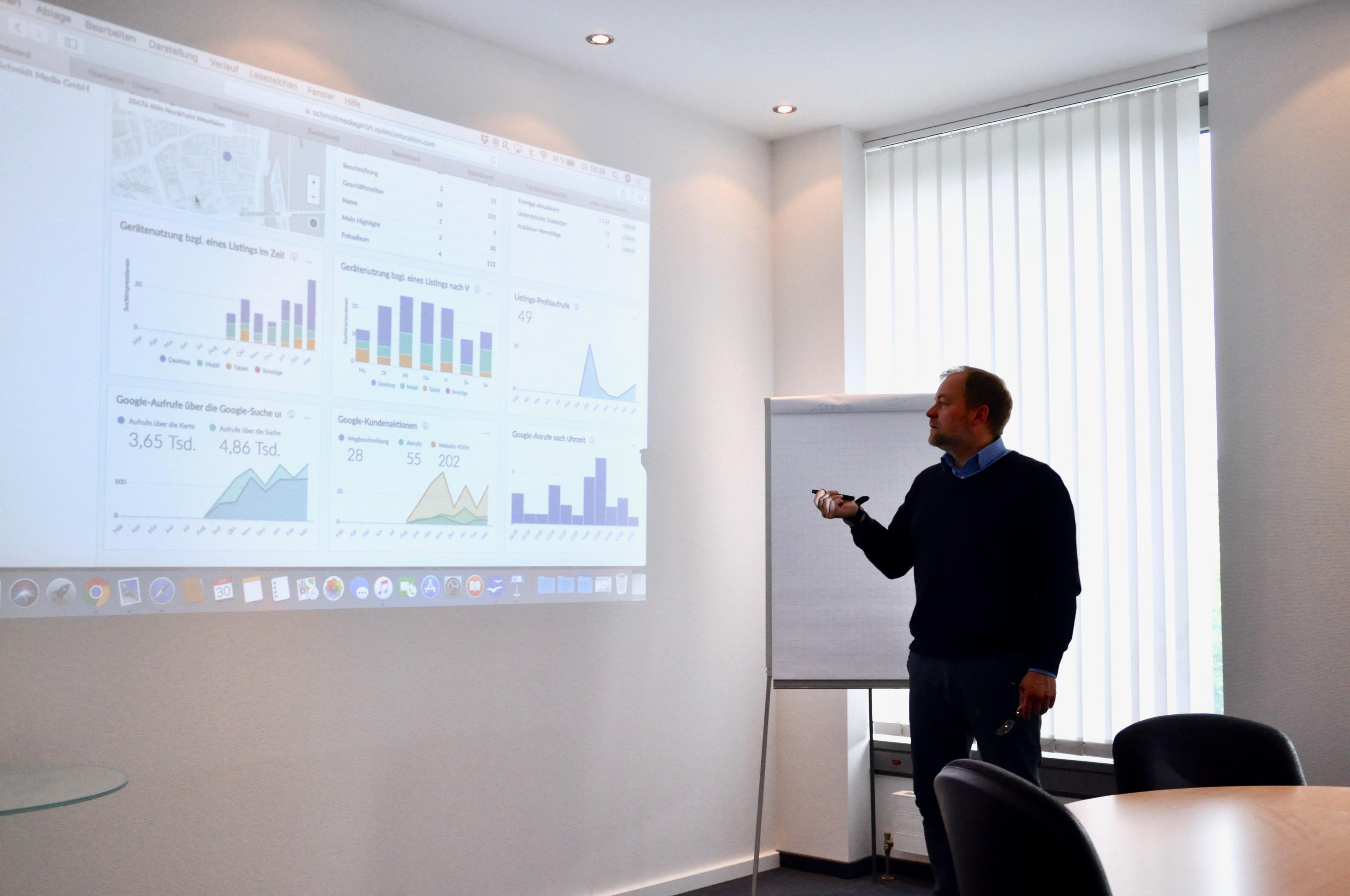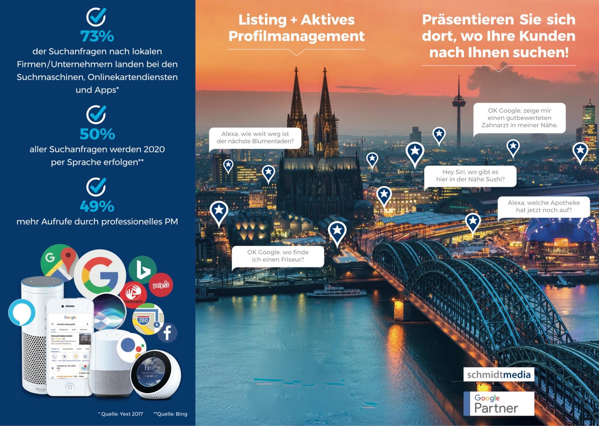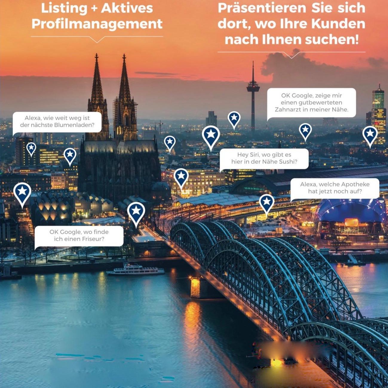 Als Online Marketing Agentur in Köln unterstützen wir, durch aktives Profilmanagement - Local Seo, Ihr Unternehmen, mit professionellen Lösungen, online besser gefunden zu werden. Relevante Daten und Informationen Ihres Geschäftes und Ihrer Leistungen werden von uns strukturiert, ohne Anmeldung und in Echtzeit, auf den wichtigsten Online-Plattformen und Suchmaschinen hinterlegt, veröffentlicht und ständig aktualisiert. Aufgrund der Informationen, über Ihren Standort, Ihrer Produkte und Leistungen und vieler anderen Daten, wird Ihr Unternehmen optimal präsentiert und Ihre Online-Präsenz erhöht sich. Professionelle Business-Fotos, modernes Webdesign und unsere langjährigen Erfahrungen im Online-Marketing werden Ihre Profile perfektionieren. Buchen Sie jetzt bei uns Ihr aktives Profilmanagement.
