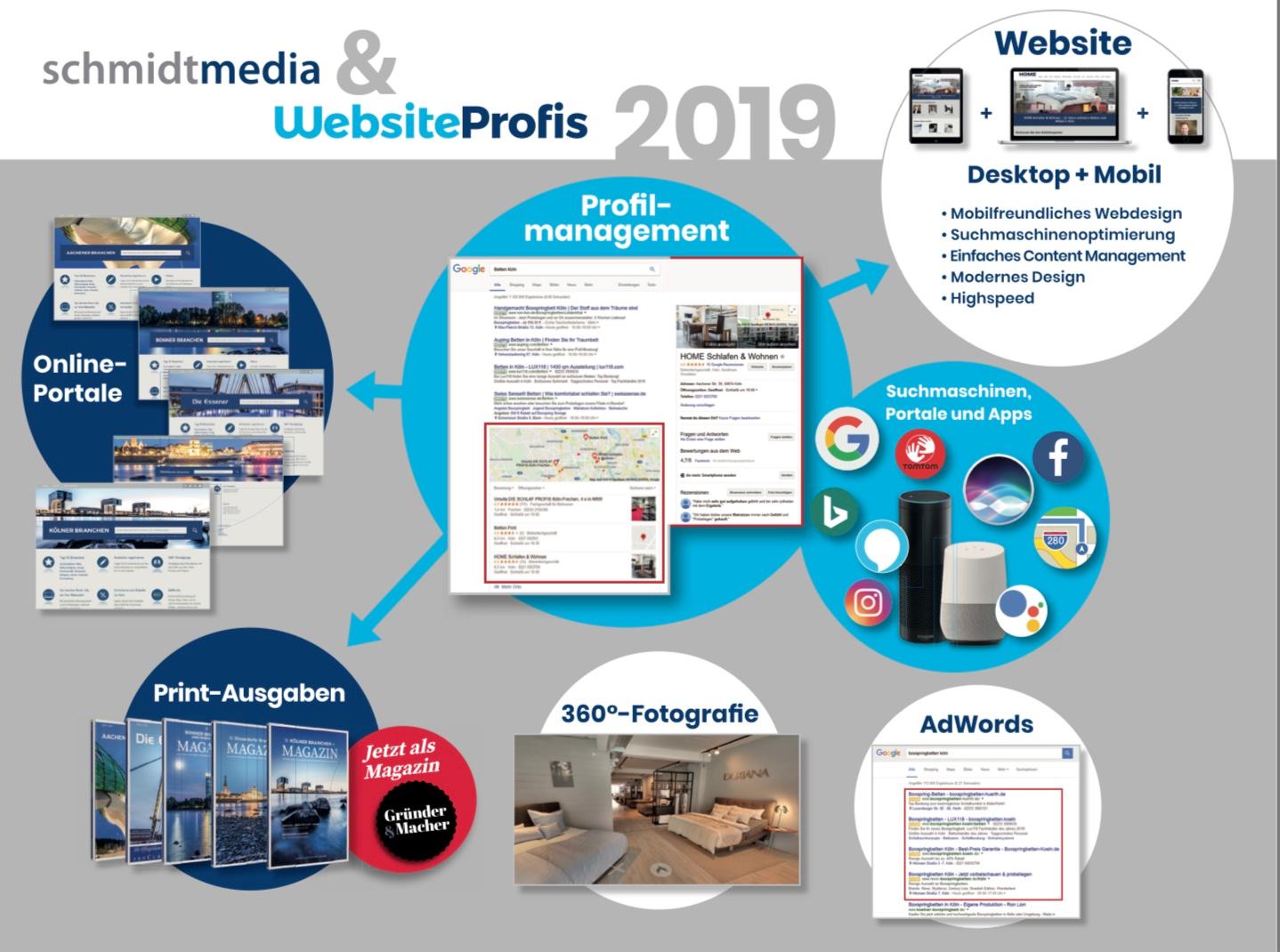 Eine Online Marketing Agentur entwickelt Online- und Geschäftskonzepte, die weit über die Gestaltung und Pflege einer Website hinaus gehen. In der heutigen Zeit erstellen Sie nicht nur Ihre Website, sondern beraten und betreuen Ihre Online-Profile im Internet, gestalten die Darstellung Ihres Unternehmens in der digitalen Welt. Daher ist es umso wichtiger, daß Ihre Internetagentur über Erfahrungen in den verschiedenen Branchen verfügt, um Sie optimal beraten zu können. Die Arbeit einer Internetagentur gleicht die eines Unternehmensberater. Wir konzentrieren uns auf das "aktive Profilmanagement". Als Internetagentur in Köln unterstützen wir Ihr Unternehmen, mit professionellen Lösungen, online besser gefunden zu werden. Relevante Daten und Informationen Ihres Geschäftes und Ihrer Leistungen werden von uns strukturiert, ohne Anmeldung und in Echtzeit, auf den wichtigsten Online-Plattformen und Suchmaschinenen, hinterlegt, veröffentlicht und ständig aktualisiert. Aufgrund der Informationen, über Ihren Standort, Ihrer Produkte und Leistungen und vieler anderen Daten, wird Ihr Unternehmen optimal präsentiert und Ihre Online-Präsenz erhöht sich. Professionelle Business-Fotos, modernes webdesign und unsere langjährigen Erfahrungen im Online-Marketing werden Ihre Profile perfektionieren. Buchen Sie jetzt bei uns Ihr aktives Profilmanagement.