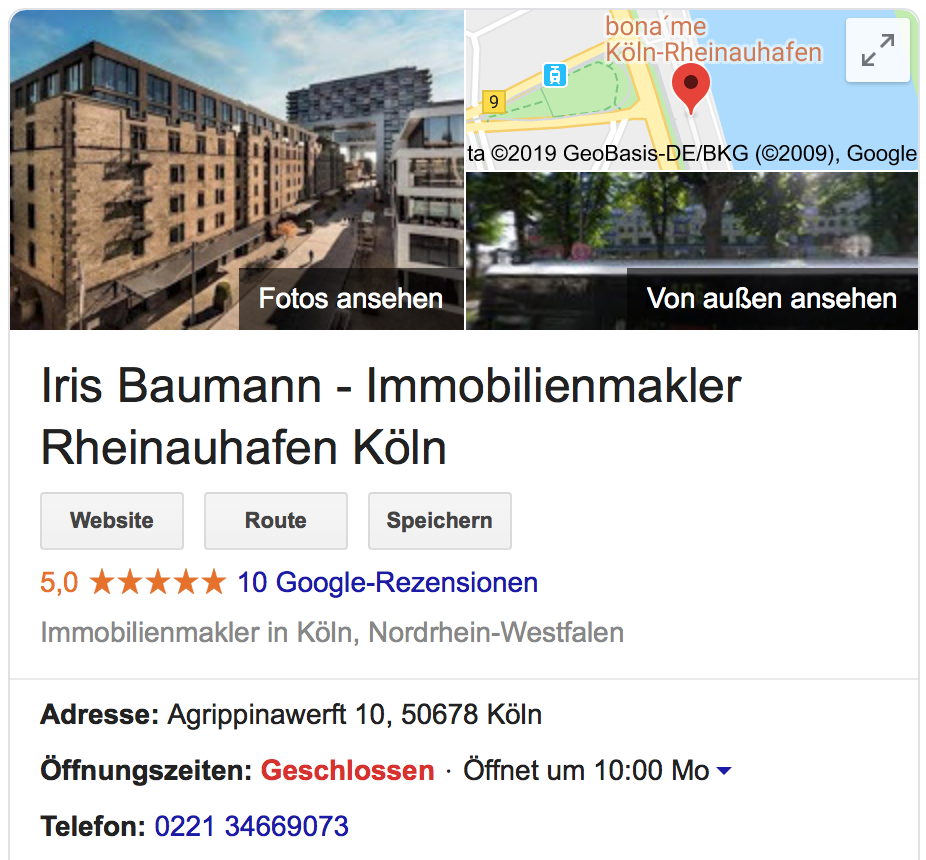 "Herr Mewes-Güzel berät mich seit mehreren Jahren schon bezüglich der verschiedenen Online-Medien und wir gestalten jedes Jahr wieder das passende Paket gemeinsam. Besonders hilfreich sind seine Kenntnisse in den verschiedenen Bereichen und die Rückspiegelung seiner Kunden, die mir die Auswahl der für mich sinnvollen Werbeplattformen ermöglichen." Iris Baumann – Immobilien, vermietet und verkauft Ihre Immobilien, erstellt Wohnkonzepte und bietet Beratung für Privat- und Geschäftskunden. Videofilme von den Verkaufswohnugen, homestaging, Internetmedien wie Instagramm und Facebook sowie unser Netzwerk werden genutzt. Wir sind haben einen Schwerpunkt unserer Objekte im Kölner Rheinauhafen, sind entsprechend auf Luxusimmobilien und das gehobene Marktsegment spezialisiert. Führen Vermietungen insbesondere in größeren Neubauarealen wie Reiterstaffel oder den Clouthwerken durch. Knapp 3 Jahrzehnte Erfahrung im Immobilienbereich. Besonderheiten von Altbauten kennen wir. Für Kapitalanlagen / Mehrfamilienhäuser haben wir die passenden Kunden. Beste Bewertungen, zufriedene Kunden."