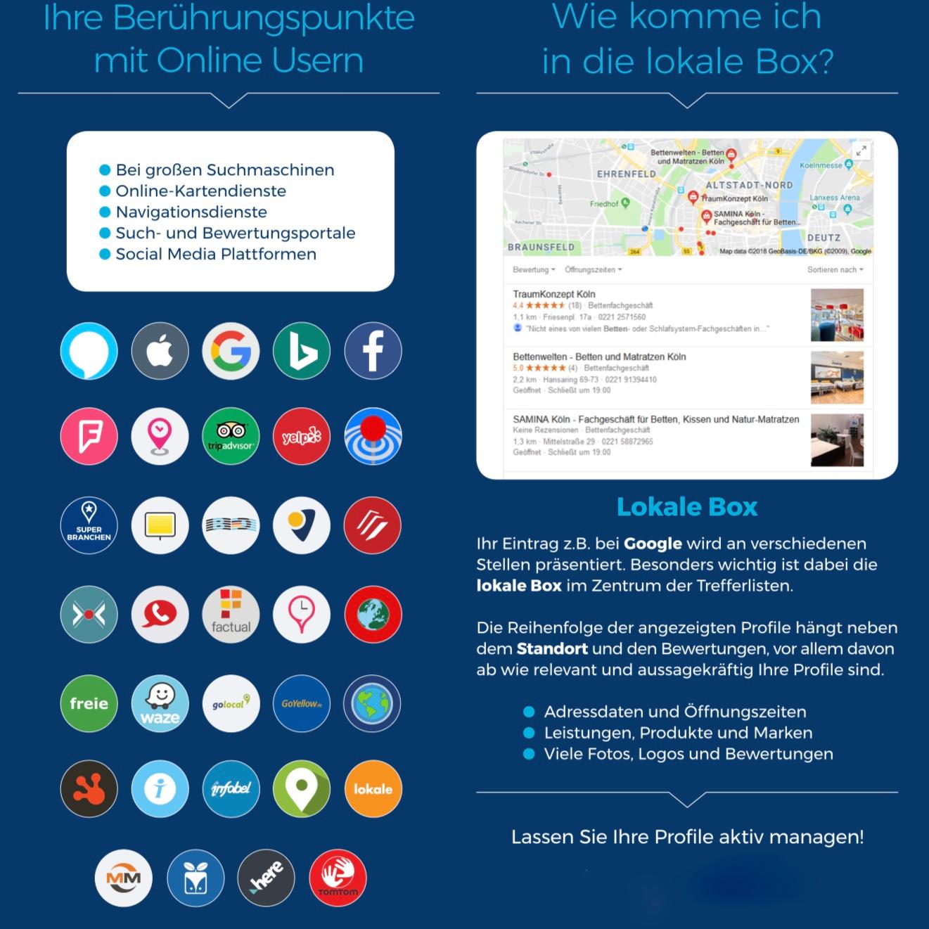 Mach's persönlich! Individuelle Beratung für die Online-Profile Ihres Gewerbes. Als Internetagentur in Köln unterstützen wir Ihr Unternehmen, mit professionellen Lösungen, online besser gefunden zu werden. Relevante Daten und Informationen Ihres Geschäftes und Ihrer Leistungen werden von uns strukturiert, ohne Anmeldung und in Echtzeit, auf den wichtigsten Online-Plattformen und Suchmaschinenen, hinterlegt, veröffentlicht und ständig aktualisiert. Aufgrund der Informationen, über Ihren Standort, Ihrer Produkte und Leistungen und vieler anderen Daten, wird Ihr Unternehmen optimal präsentiert und Ihre Online-Präsenz erhöht sich. Professionelle Business-Fotos, modernes webdesign und unsere langjährigen Erfahrungen im Online-Marketing werden Ihre Profile perfektionieren. Buchen Sie jetzt bei uns Ihr aktives Profilmanagement.