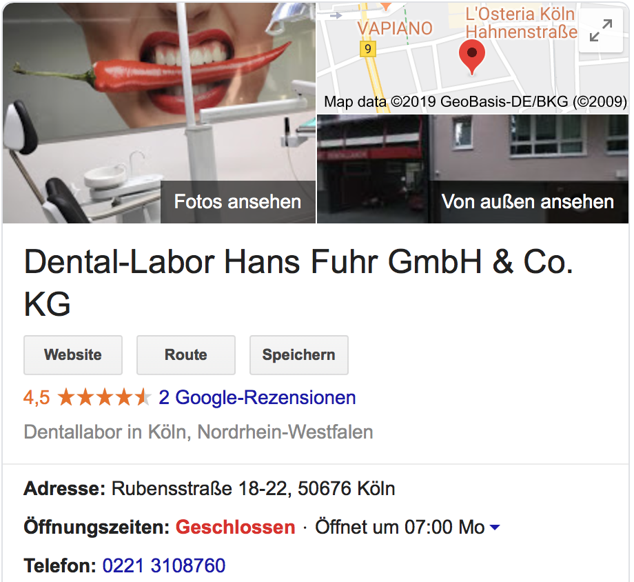 "Herr Mewes-Güzel bietet moderne Dienstleistungen im Bereich Internet Marketing an und setzt zeitnah um, was im persönlichen Gespräch zuvor angeboten wurde. Kompetent, freundlich und stets gut erreichbar. Vielen Dank für die angenehme Zusammenarbeit. Empfehlung!!" Unser Haus ist ein inhabergeführter Familienbetrieb, seit über 50 Jahren Zahntechnisches Meisterlabor im Herzen von Köln und Ihr zuverlässiger Partner wenn es um schöne Zähne, insbesondere Ästhetik, Vollkeramik und Implantatprothetik geht. Unser Qualitätsanspruch beinhaltet neben der professionellen und termingerechten Fertigung von Zahnersatz ein lückenloses Dienstleistungsspektrum, das wir mit sieben Zahntechniker-Meistern/innen auf die individuellen Anforderungen unserer Kunden abstimmen. Der Behandlungserfolg der Zahnarztpraxis ist der entscheidende Maßstab für unsere Arbeit, denn nur zufriedene Patienten besuchen unsere Kunden wieder und empfehlen Sie weiter. Als Bindeglied zwischen Technik, Mensch und Medizin wollen wir Zahnärzte mit maßgeschneiderten zahntechnischen Leistungen unterstützen, die funktional und ästhetisch auf höchstem Niveau angesiedelt sind. Den hohen Ansprüchen unserer Kunden stellen wir uns dabei ohne Einschränkung. Unsere jahrzehntelangen Erfahrungen und unsere Fachkompetenz gibt uns die Grundlage, das Vertrauen unserer Zahnärzte zu gewinnen und zu halten. In nahezu täglichen Gesprächen mit unseren Kunden sowie unserer QM-Kundenzufriedenheits-befragung verschaffen wir uns ein Feedback zu unseren Leistungen. Wir führen unser Unternehmen ehrlich, verlässlich und fair. Unser oberstes Ziel sind zufriedene Kunden mit dauerhaftem Vertrauen in unsere Produkte und Dienstleistungen. Das Denken in Kundenvorteilen und Kundennutzen hat höchste Priorität. Dental-Labor Hans Fuhr Ihr Partner für schöne Zähne Innovation und Verlässlichkeit seit 1963