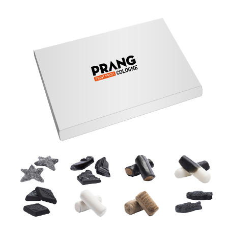 Bärenbox Black Box Ganz egal ob Geburtstage, Hochzeiten, Taufen, Einschulungen, Konfirmationen, Give-Aways, oder einfach als kleines Dankeschön, mit den individualisierbaren Black-Boxen von Prang Cologne aus Köln haben Sie ein charmantes und unvergessliches Geschenk für jeden Anlass. Laden Sie einfach Ihre Bilder oder Logos hoch und Gestalten Sie mit nur wenigen Klicks, stilvolle und unvergessliche Geschenke. Die Boxen sind mit 8 leckeren Sorten Lakritz von Nordsee gefüllt: Seesterne, Schiffchen, Salmiak Rocks, Magic Sticks, Rauten, Kreide, Knock-Out, Fische