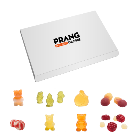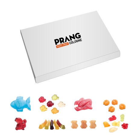 Bärenbox Spezialitäten Box Ganz egal ob Geburtstage, Hochzeiten, Taufen, Einschulungen, Konfirmationen, Give-Aways, oder einfach als kleines Dankeschön, mit den individualisierbaren Spezialitätenbox von Prang Cologne aus Köln haben Sie ein charmantes und unvergessliches Geschenk für jeden Anlass. Laden Sie einfach Ihre Bilder oder Logos hoch und Gestalten Sie in wenigen, intuitiven Schritten eine ganz persönliche Spezialitätenbox. Die Boxen sind mit 8 köstlichen Sorten Früchtgummi von Nordseebär gefüllt: Apfelstrudel Bären, Waldmeister Zwerge, Pfirsiche, Ingwer-Kirsch, Erdbeer-Sahne Wirbel, Ingwer-Chili Bären, Sanddorn Bären und Rote Grütze