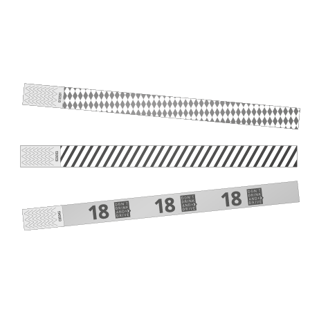 Tyvek-Bänder Design Die praktischen Einlassbänder aus papierähnlichem und reißfestem Tyvek mit vorgefertigten Motiven von Prang Cologne in Köln werden mit einem Klebestreifen verschlossen. Beim Öffnen des Klebestreifens wird die Perforation am Band zerstört. Somit sind unsere Tyvek-Bänder genau so sicher wie Einlassbänder mit Plastik-Verschluss und nicht übertragbar. Durch die vorgefertigten Muster heben Sie sich von der Masse der einfarbigen Bänder ab und sparen dennoch die Kosten für einen eigenen Aufduck. Sie haben die Auswahl aus 8 Motiven, darunter Kinderbänder für die Anwendung bei großen Menschenmassen und Bänder zur Kennzeichnung 16- und 18 jähriger zur sicherstellung des korrekten Alkoholausschanks.