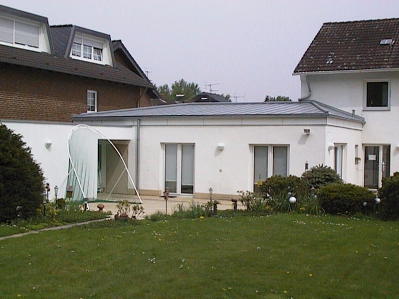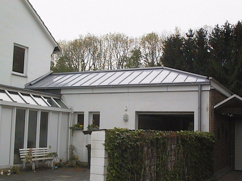 Der Bauherr wünschte sich einen Schutz der Fassade vor Witterungseinflüssen wie Schlagregen. Außerdem sollte der Zugang zur Garage auch bei Regen trockenen Fusses möglich sein. Mit der abgeschleppten Variante der Vordachkonstruktion haben wir den Wunsch des Bauherrn erfüllt. Optisch wurde die strassenseitige Dachkonstruktion durch das Abschleppen des Vordachbereiches aufgewertet.