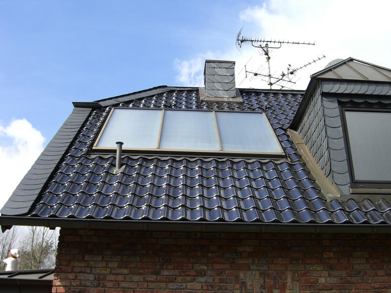 Besonderheiten Antrag muss vor Baubeginn der Anlage gestellt werden, es muss aber nicht auf eine Bewilligung gewartet werden, der Bauherr kann nach Antragstellung mit dem Bau der Anlage beginnen. Die Zuschüsse werden nachträglich gezahlt. Das Programm ist finanziell mit Zuschüssen gut ausgestattet. Mit der Solaranlage zusammen können eventuell noch andere Energiesparmaßnahmen gefördert oder finanziert werden. Mit Mitteln der KFW können z. B. Dacherneuerungen mit entsprechender Wärmedämmung, Fassadendämmung, Heizung, Fenster und Solaranlagen finanziert werden. Bei der Antragstellung müssen keine weiteren Unterlagen eingereicht werden. Anlagen zur Schwimmbaderwärmung werden nicht gefördert. Beispiele für Solartechnik Für eine Dachfläche war der Einbau bauseits gebauter Thermokollektoren geplant. Die vorhandene Dachstuhlkonstruktion konnte das durch die bauseits errichteten Thermokollektoren entstehende, zusätzliche Gewicht aufgrund verschiedener Faktoren nicht aufnehmen. Wir konnten den Bauherrn von dem Einbau eines Braas-Thermokollektors TK 6 über zeugen, der wesentliche Vorteile gegenüber anderen Systemen hat. Der Thermokollektor TK 6 von Braas liegt wie ein Wohnraumfenster in der Dachfläche. Bei einem Betondachstein von Braas kann der Kollektor exakt auf die Ziegeleindeckung abgestimmt werden. Dadurch bedingt liegen unterhalb des Kollektors keine Dachsteine, so dass der Kollektor letztendlich im eingebauten Zustand weniger Gewicht hat als die Ziegeleindeckung im gleichgrossen Bereich.