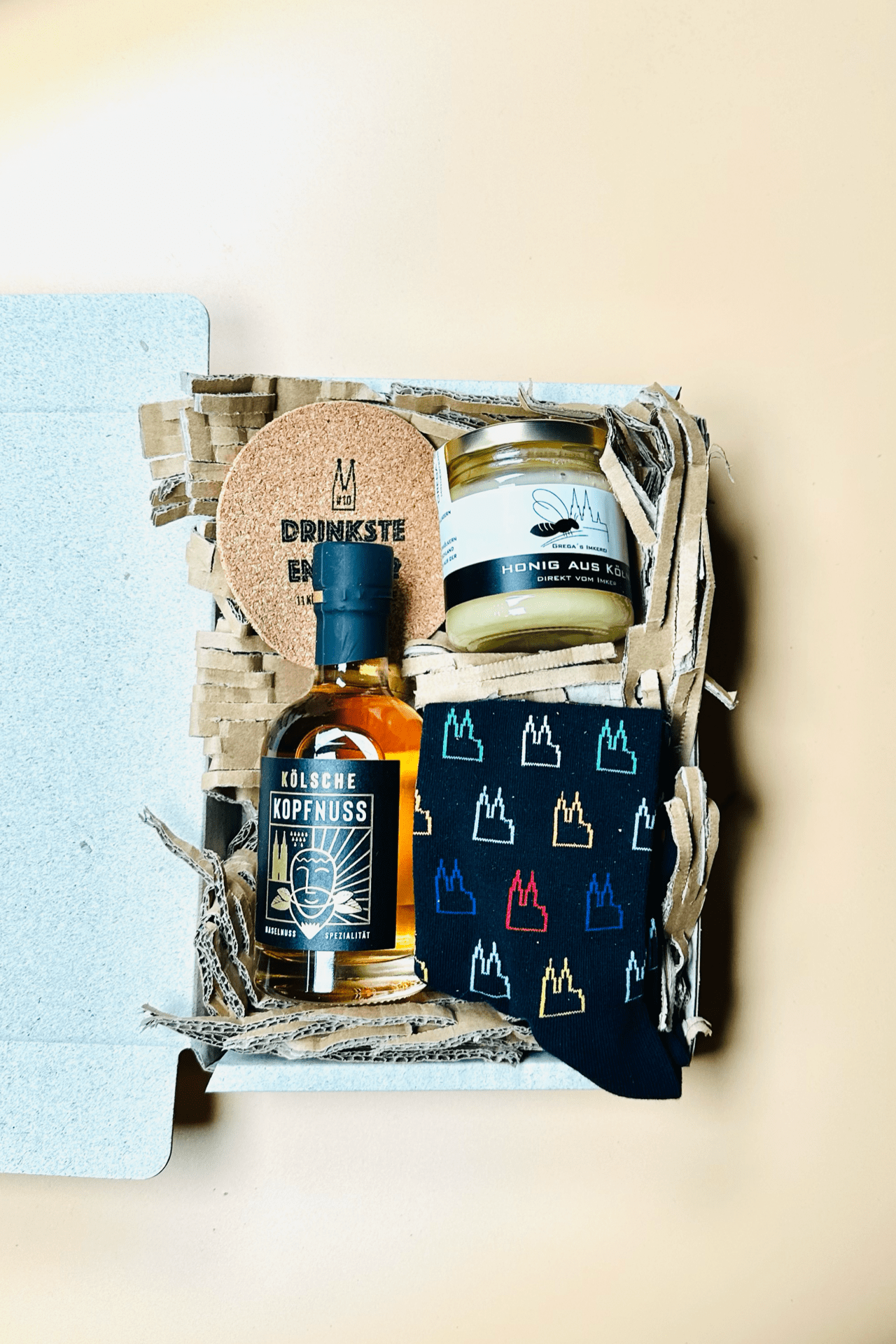 Das Köln Paket Bunte kölsche Mitbringsel als Geschenk. Mir sin zo Hus in Köllefornia: Zollywood, Côte à Sürth, Ulreforteventura, Kalkidiki, Rodenkirchener Riviera, Lloret de Maarweg, Porzugal, Riehl'o de Janeiro, Beverly Sülz, Brücklyn, Miami Weiß, Playa de Poll, Dellbronx. Ganz egal, wo euer geliebtes Zuhause in Köln ist – besonders ist es allemal! Wer wollte das nicht schon mal in einem Geschenkset zum Ausdruck bringen? Wir haben das für euch in Angriff genommen. Damit das nächste Geschenk echt kölsch wird. Das sind auch unsere Produkte, die zum Großteil aus den kölschen Veedeln stammen. Hier haben wir für euch ein Köln Paket zusammengestellt, das nicht nur namentlich in den Produkten unsere Liebe zu dieser Stadt widerspiegelt, sondern – wie wir finden – auch im Inhalt. Denn: Hey Kölle, do bes e Jeföhl!