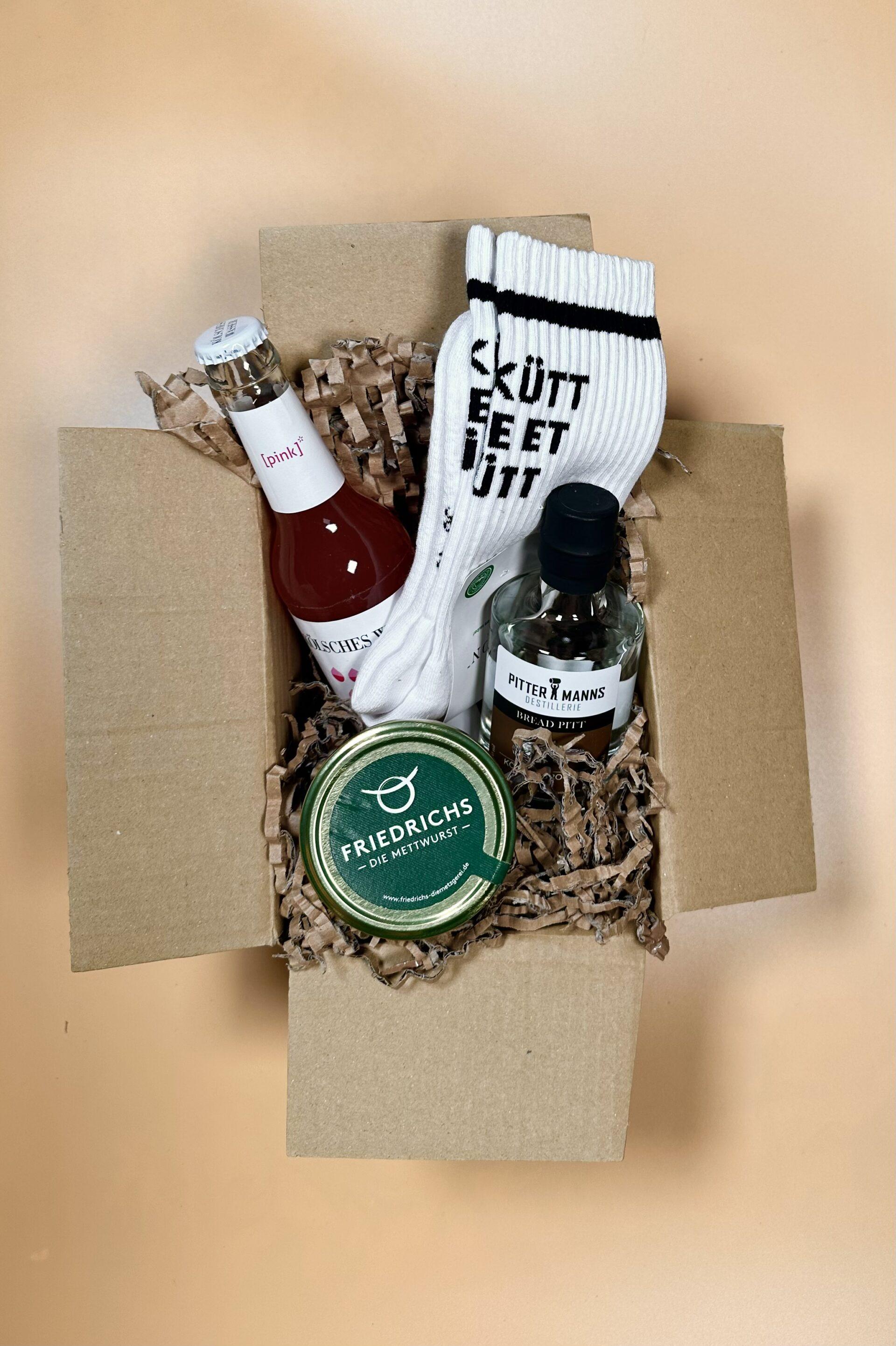 Kölsches Geschenk Paket 1 Stk. Kleine Mitbringsel als Geschenk aus der Domstadt. Ob ihr ein Erinnerungspaket aus Köln mit in die Heimatstadt mitnehmen möchtet, oder Jemanden aus der Ferne ein Stück Köln zuschicken möchtet: Ein Kölsches Geschenk Paket von Kölner Manufakturen kommt gut an! Hier haben wir für euch eins zusammengestellt, das nicht nur namentlich in den Produkten unsere Liebe zu dieser Stadt widerspiegelt, sondern – wie wir finden – auch im Inhalt. Denn: Et kütt wie et kütt! Was ist im Paket? Et kütt wie et kütt Socken Größe 36-40 Mettwurst Kölsche Wasser Limo Kölner Brot Gin